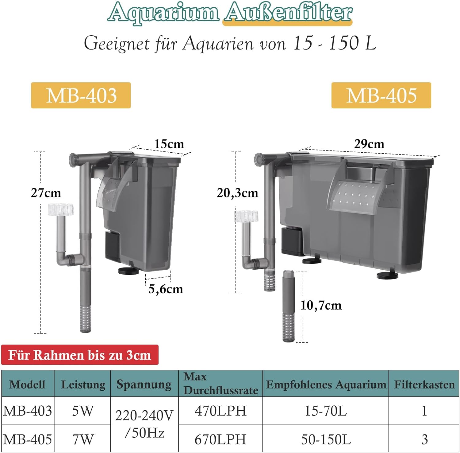 VILLNO 470L/H verstellbarer Aquarienfilter, geeignet für 15-70L Aquarien. Passend für rahmenlose Aquarien sowie Aquarien mit einem Rahmen bis 3 cm. Der leistungsstarke 5W-Aquarienfilter mit großem Filterfach enthält 1 Filterschwamm und 1 Beutel Aktivkohle. Der Filterkasten ist sehr leicht zu reinigen, Sie können auch selbst andere Filtermaterialien einbauen, um eine bessere Filterleistung zu erzielen.