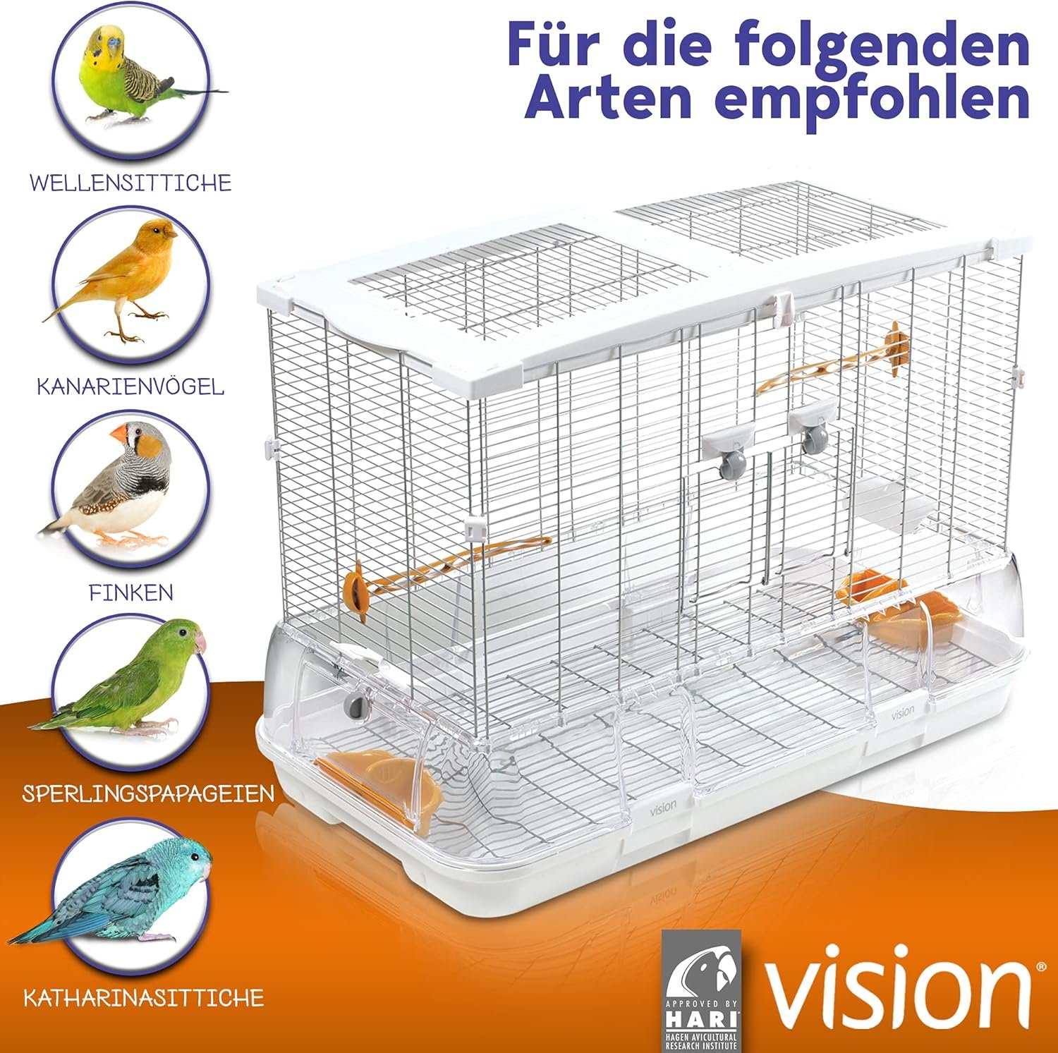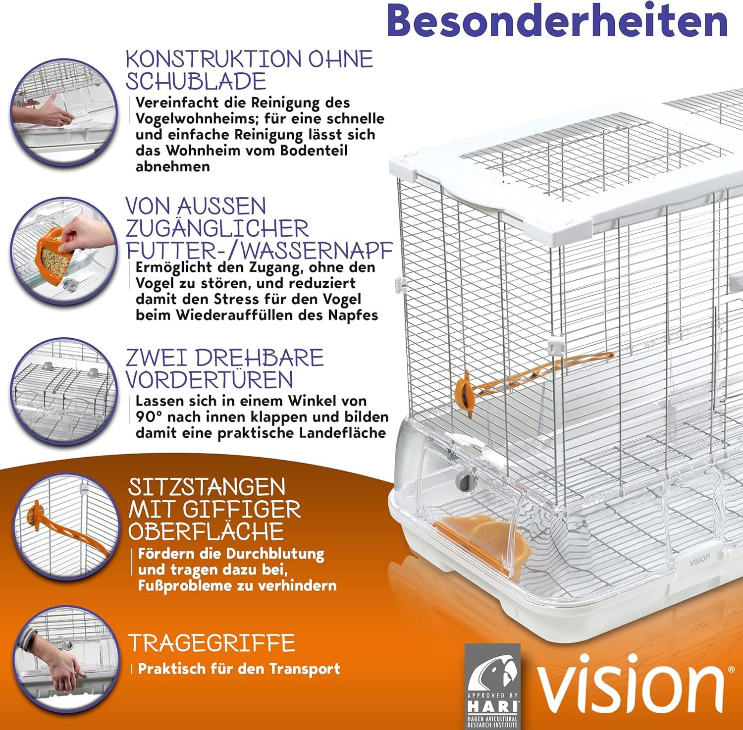 4 verschiedene ModelleMit einer oder zwei EtagenInnenausstattung in 3 verschiedenen FarbenTiefe Basis mit Schmutzfänger, um Schmutz und Ablagerungen im Vogelhaus zu halten.Futter- und Wassernäpfe sowie Vogelsitzstangen.Einfach zu montierende KonstruktionKonstruktion ohne Schrauben, Haken oder Werkzeug