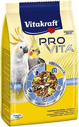 Vitakraft Pro Vita ist ein ausgewogenes, tierärztlich entwickeltes Hauptfutter für Großsittiche und Kakadus – mit dem Plus für ein gesundes Vogelleben. Denn die funktionelle Mischung enthält viele leckere Zutaten, die einzigartige Vita-Formel, eine von unseren Vogelexperten speziell entwickelte Kombination aus hochwertigen Omega-3-Fettsäuren und einer optimalen Balance an essentiellen Aminosäuren. Pro Vita garantiert somit eine rundum perfekte Versorgung der Tiere – für ein gesundes Herz, mehr Aktivität und ein verbessertes Wohlbefinden.