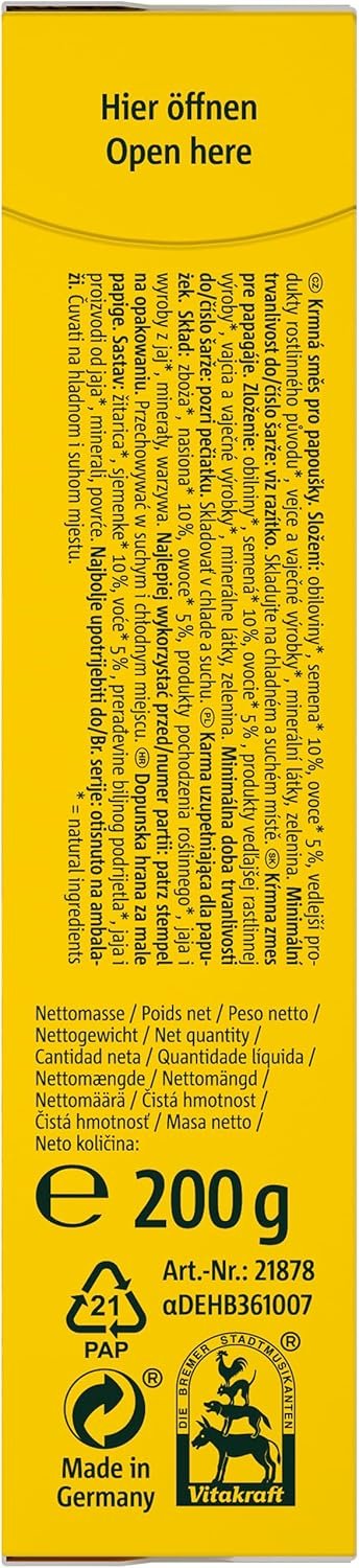 Produktbeschreibung: Cocktail-Frucht-Papag; Zutaten: Getreidesamen, 10 % Früchte, 5 % Öle und Fette, Eier und Eiprodukte, Mineralstoffe.