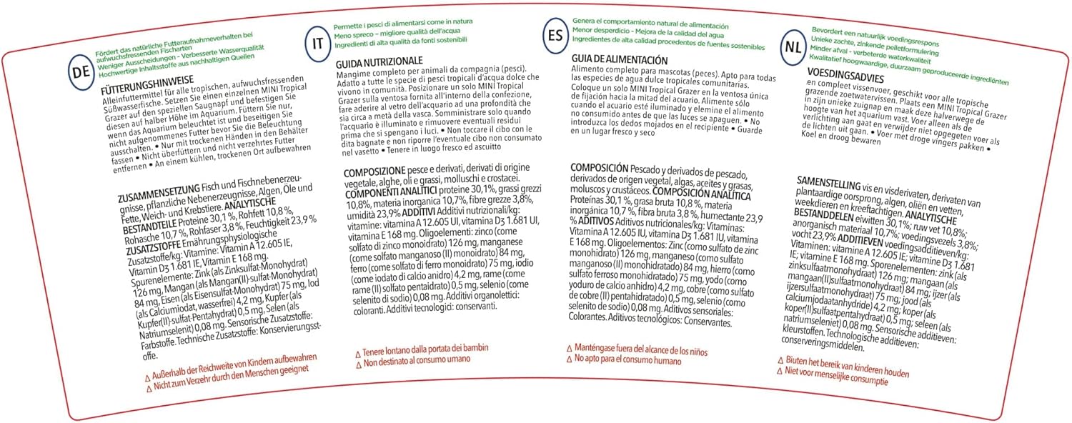 Natürliche Pigmente und sauberes Wasser – Neben dem einzigartigen Verhältnis von Vitaminen und Mineralstoffen werden die Fische mit natürlichen Pigmenten versorgt, die für eine gesunde und schöne Färbung der Außenhaut sorgen. Die Tropical Mini Grazers können außen am Aquarium angebracht werden und lösen sich nach einiger Zeit auf natürliche Weise auf, ohne Rückstände zu hinterlassen.