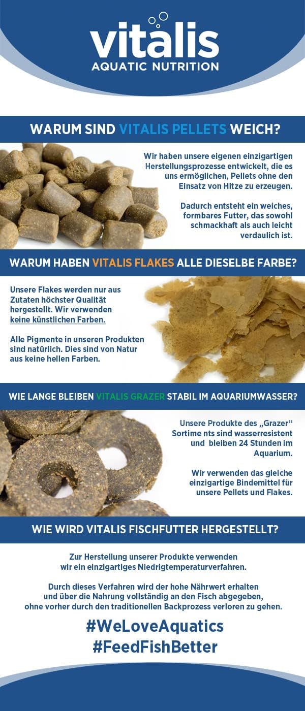 Qualität: Unsere Vitalis Tropical Pellets werden aus hochwertigen Rohstoffen mit modernsten Fertigungsmethoden hergestellt. Das perfekte Fischfutter für Ihre Süßwasserfische. Ob Aquarium oder Teich.