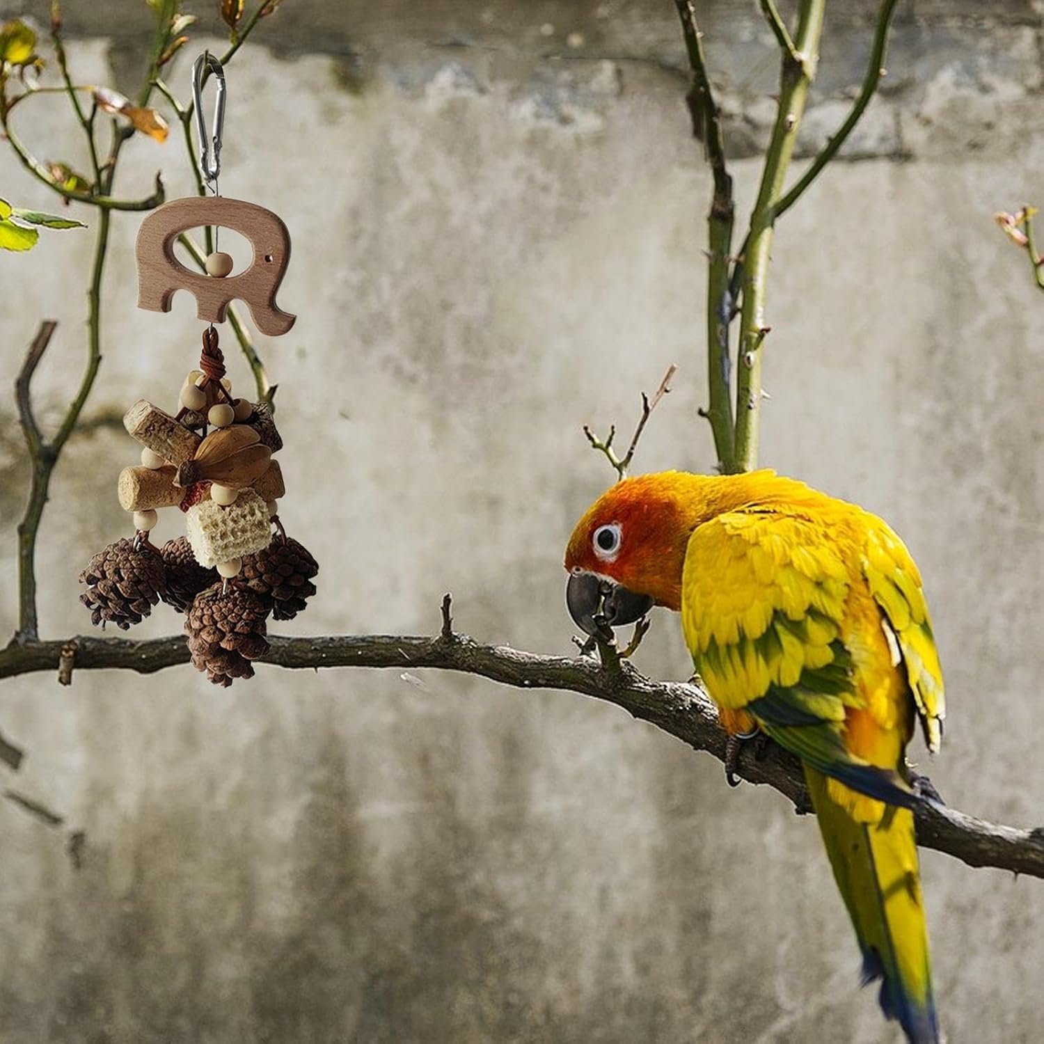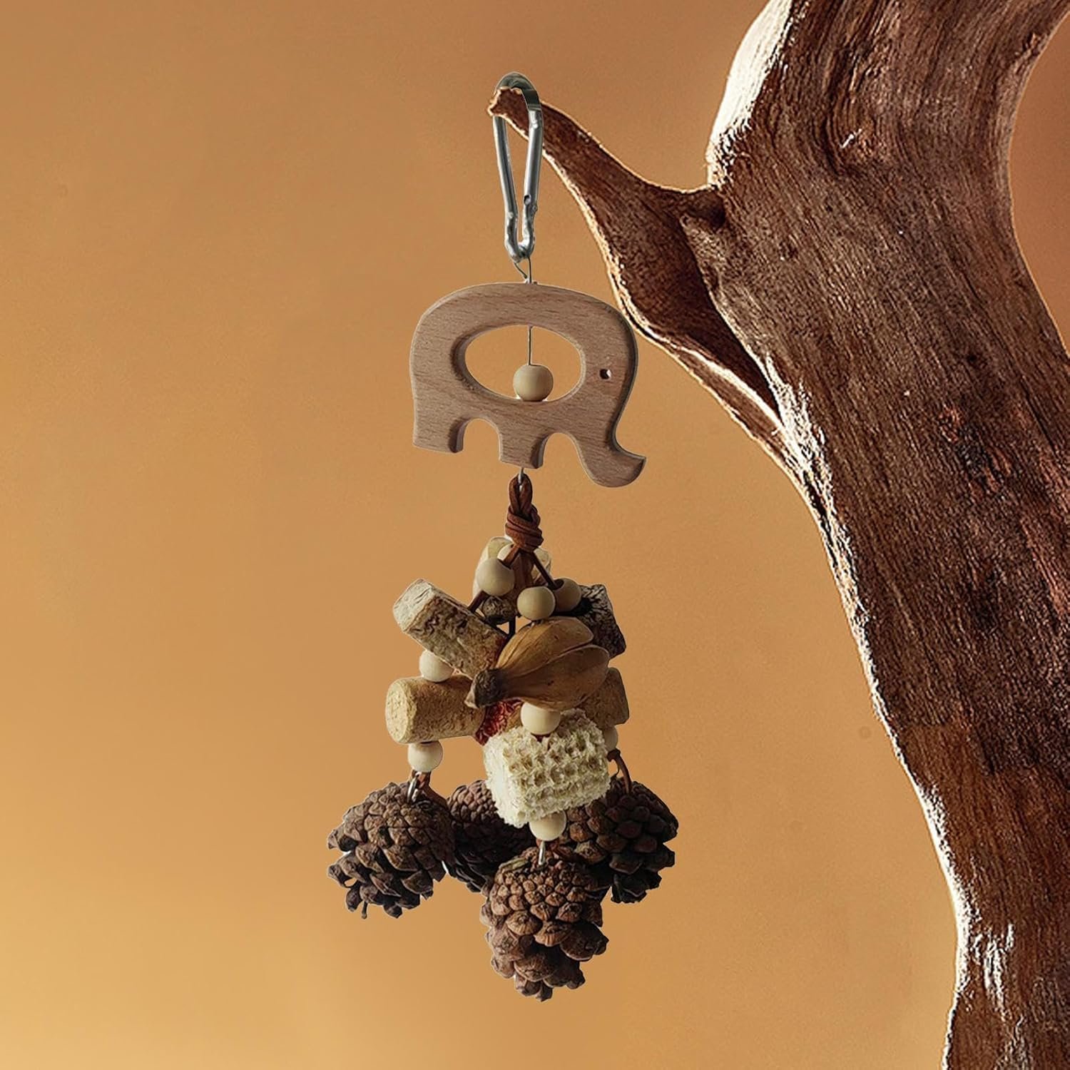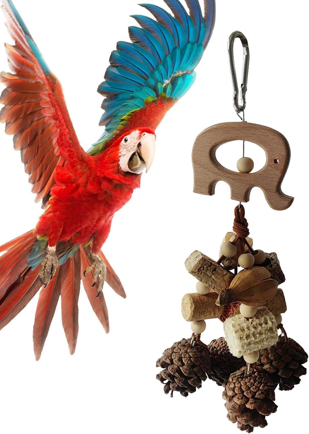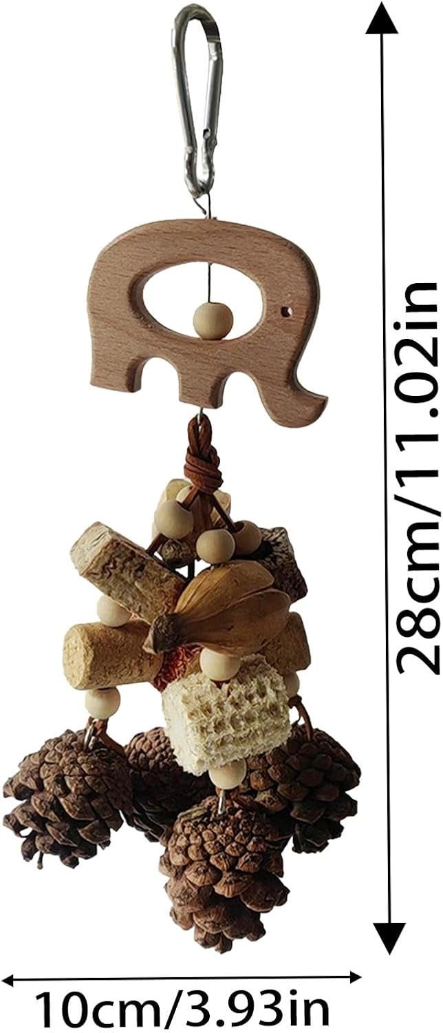 Entwickelt, um dem häufigen Kauen von Papageien standzuhalten und ihre Kaubedürfnisse zu erfüllen, stimuliert das Spielzeug Tannenzapfen und Nüsse, die in ihrer natürlichen Umgebung zu finden sind. Das glatte Holzmaterial verleiht das Aussehen von echtem Holz und ist nicht nur schön, sondern auch stabil.