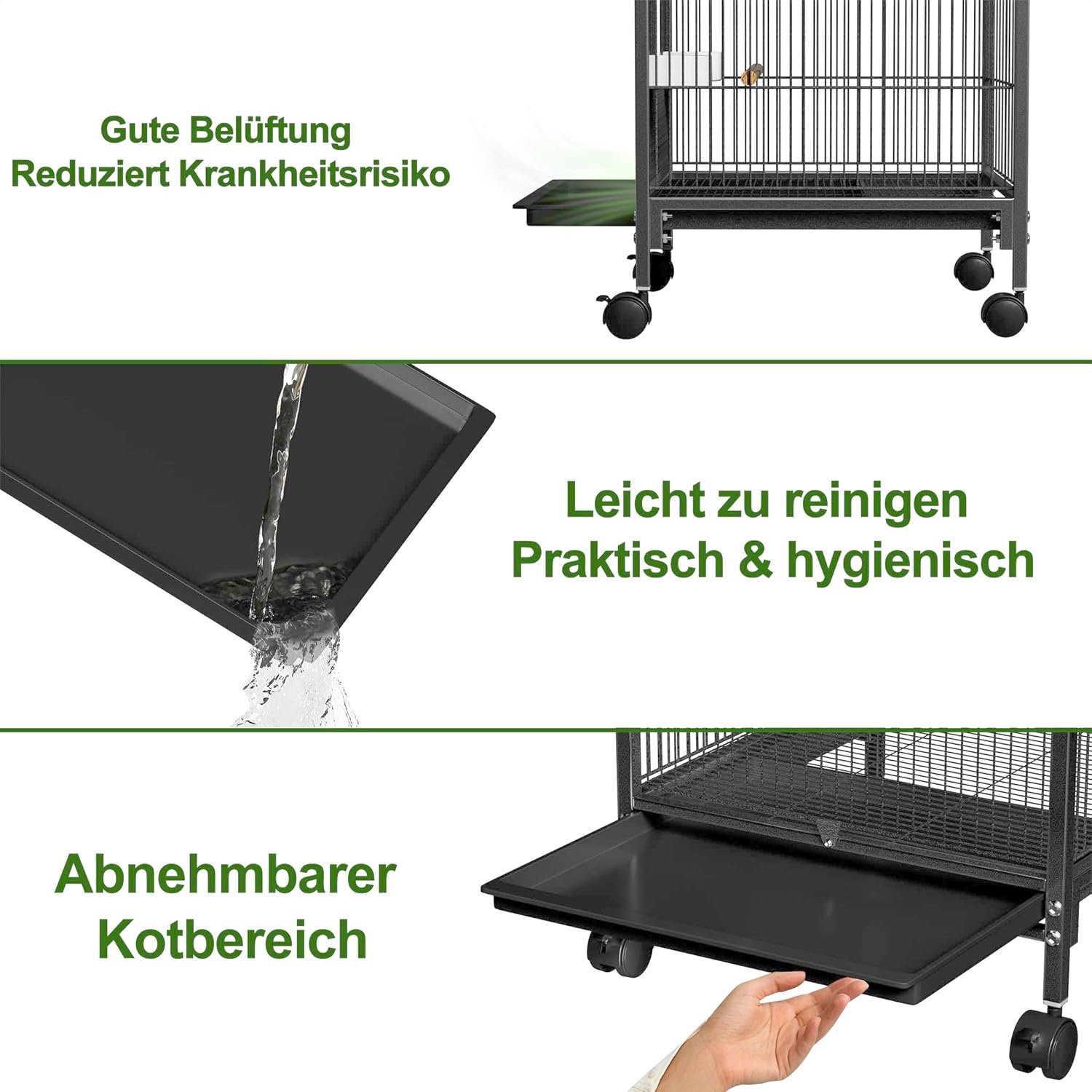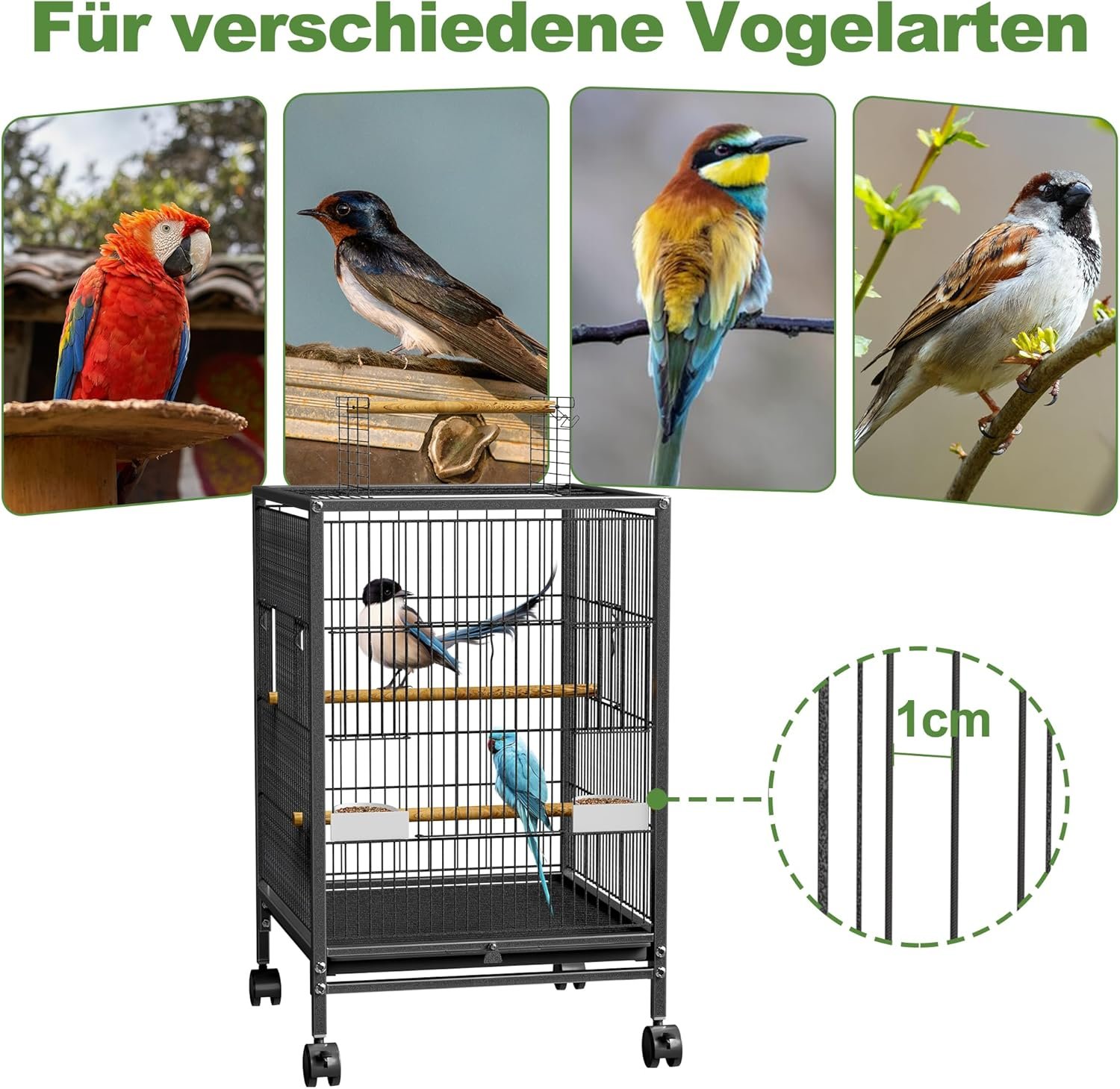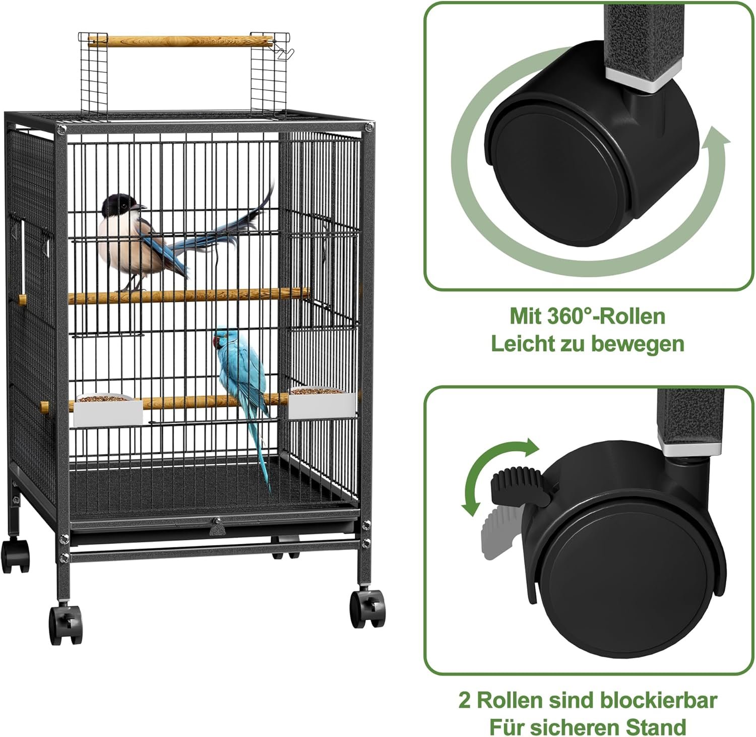 Flexible Platzierung – immer der beste Standort: Mit 4 Lenkrollen (2 mit Bremse) können Sie den Käfig einfach im Raum positionieren. Ob am Fenster zum Sonnenlicht oder in der Mitte zum Putzen, Ihr Vogel genießt immer den idealen Platz. Die Räder sorgen für Stabilität und einfache Bewegung ohne Kraftaufwand