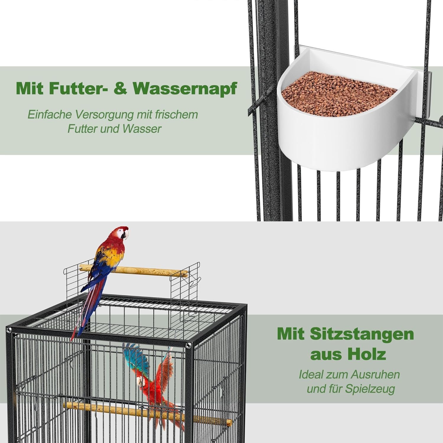 Das spezielle Öffnungsdach und die doppelseitigen Futtertüren machen Pflege und Fütterung zum Kinderspiel. Enthält 3 Naturholzstangen und 2 Futterspender – alles für das Wohlbefinden Ihres Vogels!