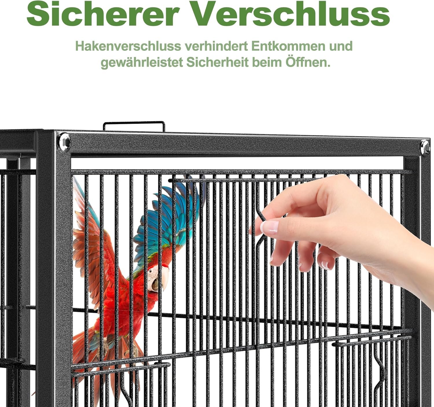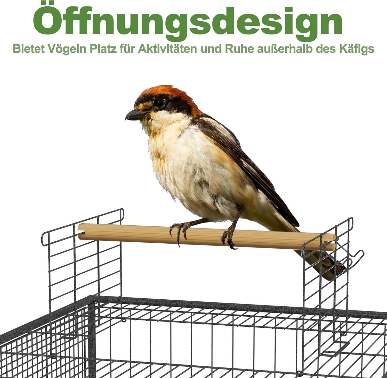 Innovatives Dach – Freiheit auf Wunsch: Das einzigartige Öffnungsdach verwandelt den Käfig im Handumdrehen in eine offene Voliere. Ihr Vogel kann zwischen geschütztem Rückzugsort und freierer Umgebung wählen – für mehr Abwechslung und Lebensqualität. Das spezielle Design fördert das natürliche Verhalten Ihres Vogels