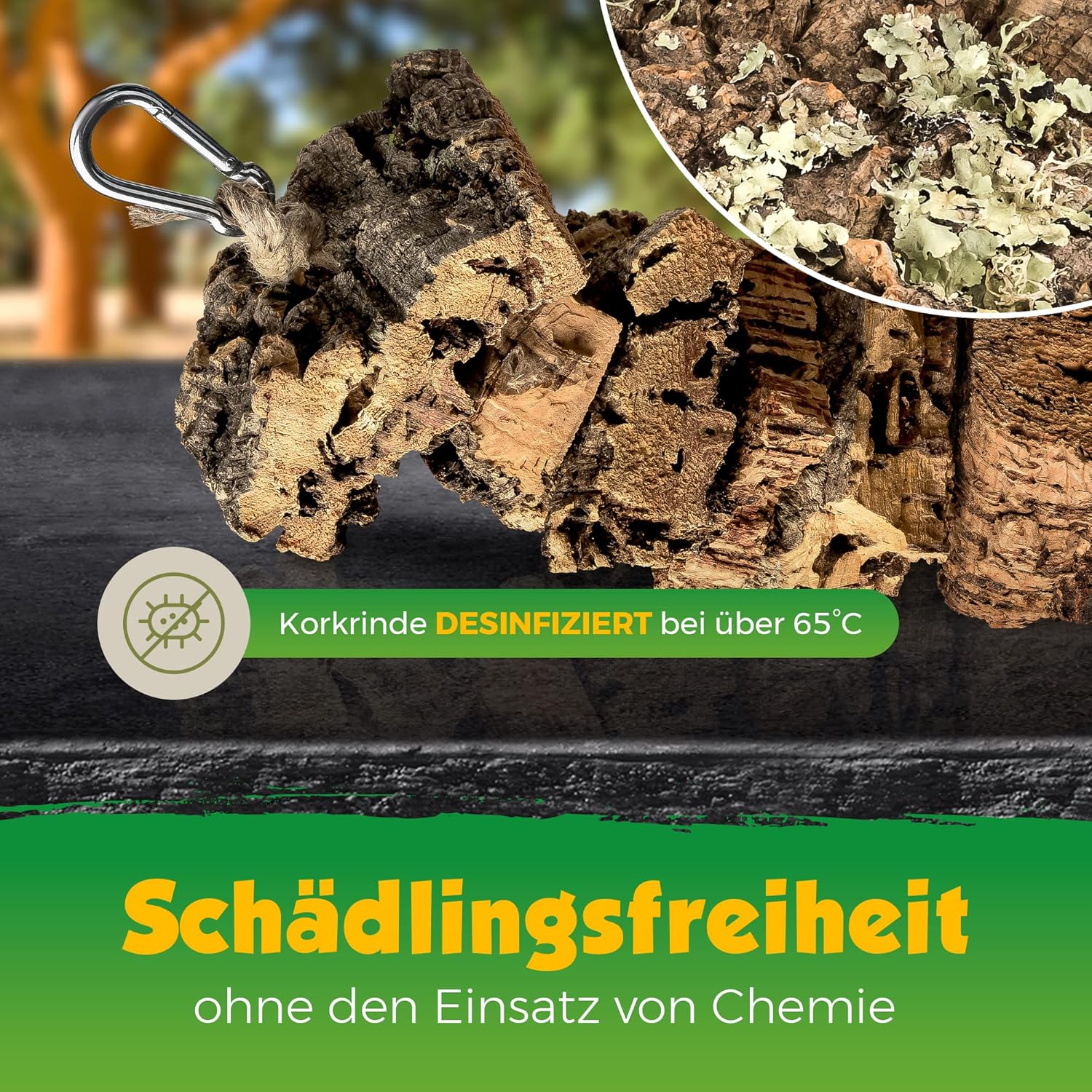 Nachhaltiges Vogelspielzeug – hergestellt aus natürlicher Korkrinde, einem nachwachsenden Rohstoff. Umweltfreundlich und nachhaltig. Um die Korkrinde zu erhalten, wird kein Baum gefällt, sondern nur die Rinde des Baumes geerntet. Der Baum lebt weiter und die Rinde wächst nach
