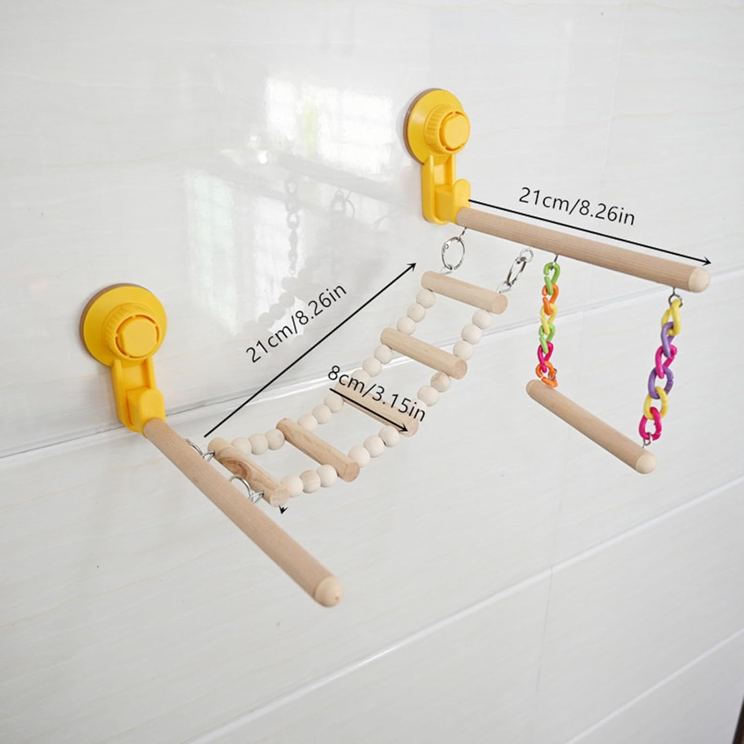 Diese Schaukel wurde für kleine und mittelgroße Vögel entwickelt und bietet Vögeln einen sicheren Ort zum Ausruhen und Spielen. Die mitgelieferten Saugnäpfe können fest auf glatten Oberflächen wie Fliesen, Marmor, Glas und Holzbrettern haften. Die Leiter ist so konstruiert, dass sie Picken und Hüpfen standhält und Ihrem Vogel ein sicheres und unterhaltsames Spielerlebnis bietet.