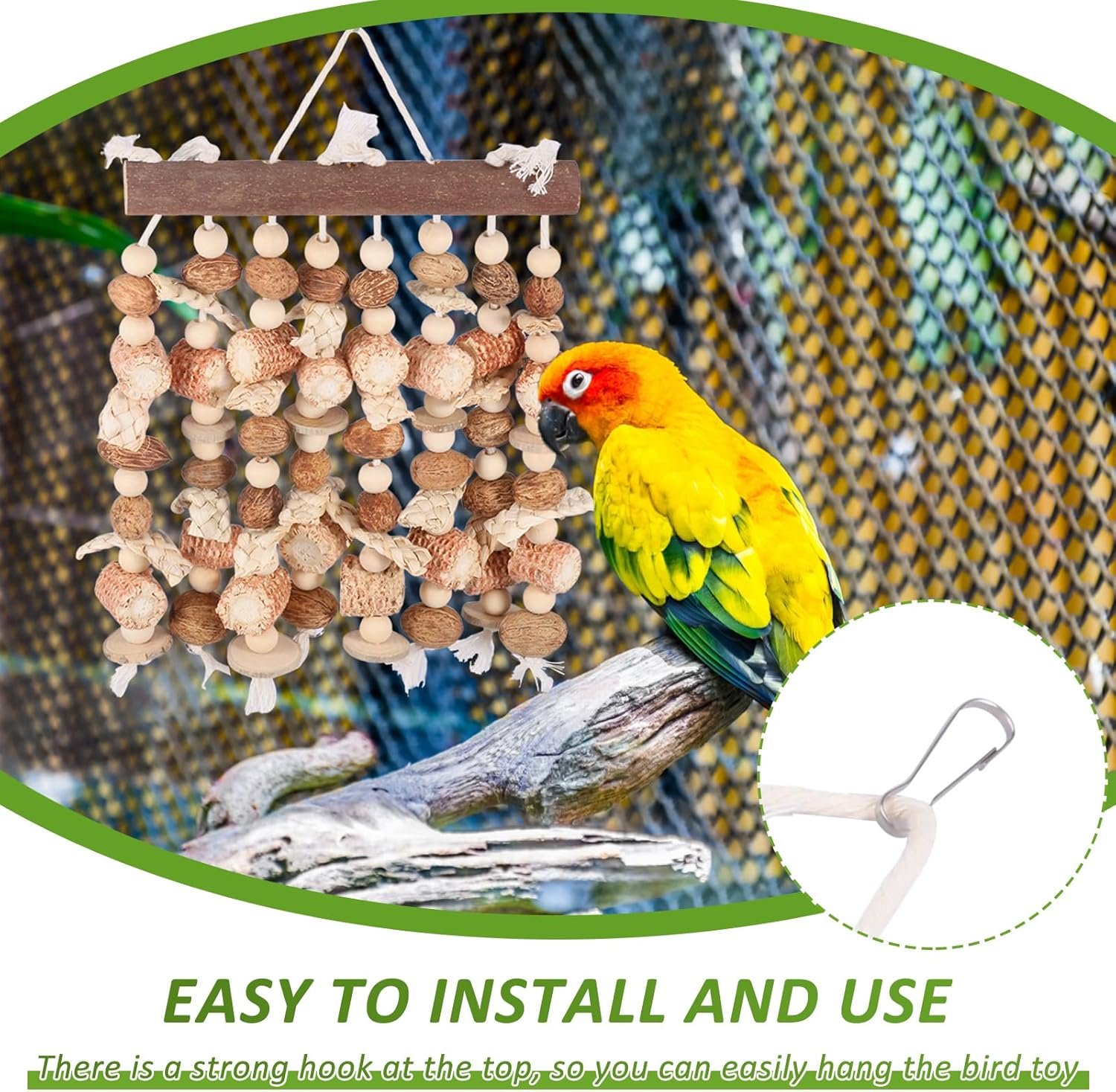 Einfache Montage und Verwendung: Dieses Vogelspielzeug wird mit einem Haken geliefert, der einfach oben und an der Seite des Käfigs befestigt werden kann. Es ist praktisch und ästhetisch ansprechend und ein tolles Zubehör für Ihren Papageienkäfig