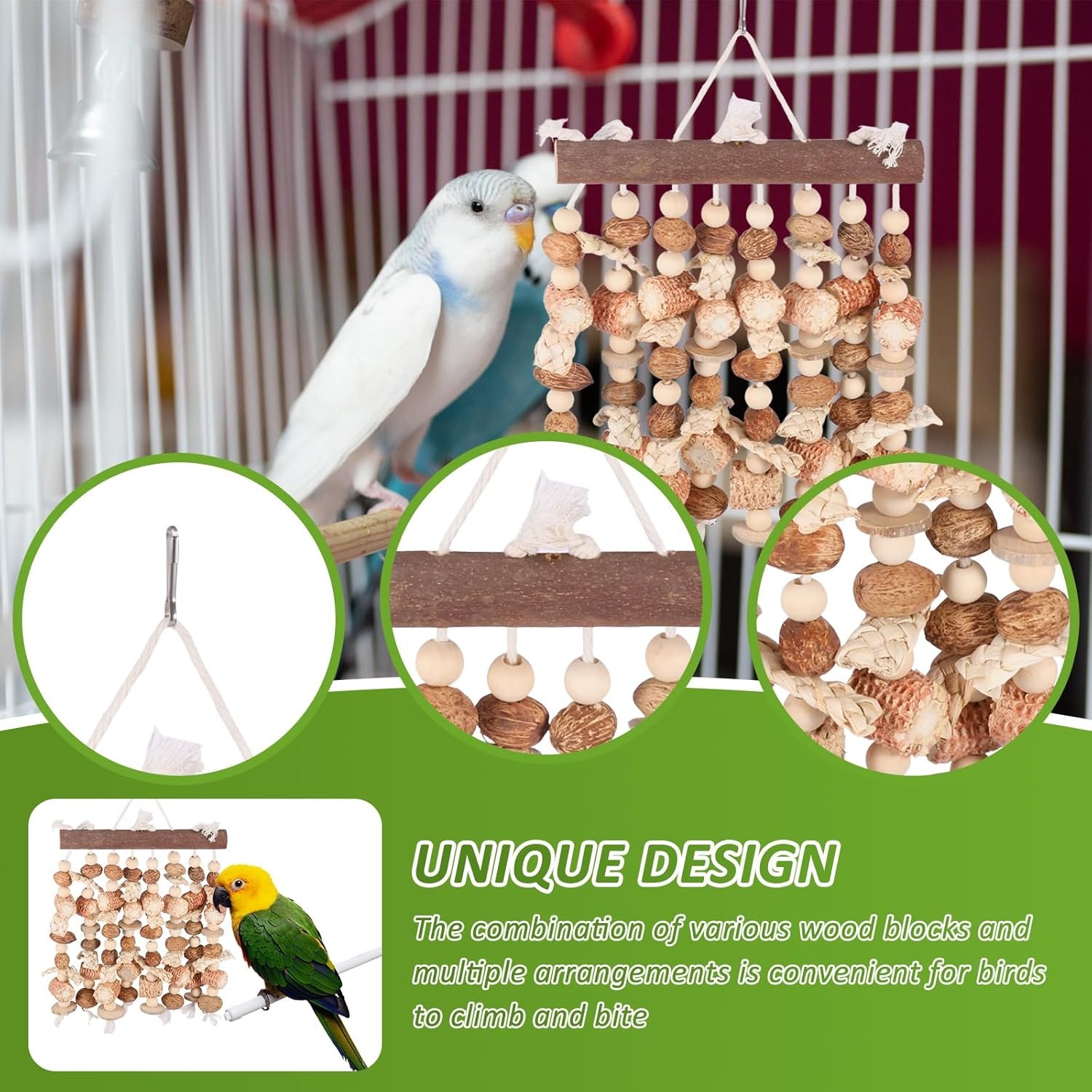 [2] EINZIGARTIGES DESIGN: Dieses Vogelkauspielzeug besteht aus einer mehrschichtigen Anordnung verschiedener Holzklötze, die Vögeln das Klettern, Kauen und Erkunden ermöglichen und so ihren natürlichen Kauinstinkt fördern und natürliche Strukturen erkunden.