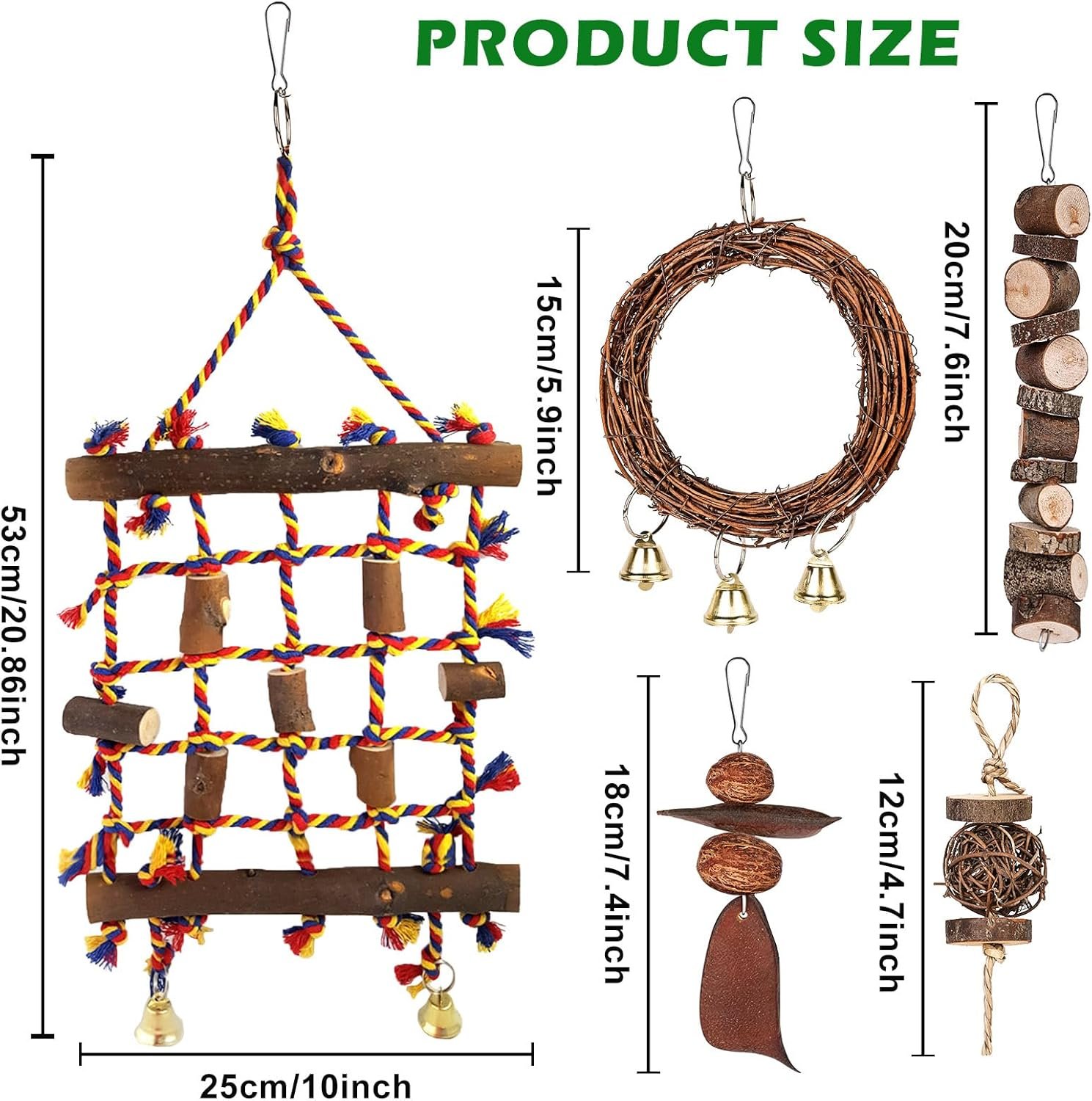LUSTIGES VOGELSPIELZEUG Das Vogelspielzeug umfasst fünf verschiedene Arten von Naturholzspielzeugen. Die Vielfalt an Spielzeugen wie Schaukeln, Kletternetzen und Kauspielzeug sorgt dafür, dass Ihre Vögel Spaß haben und aktiv bleiben. Das Vogelseil-Kletternetz sorgt für zusätzlichen Spaß und Abwechslung.
