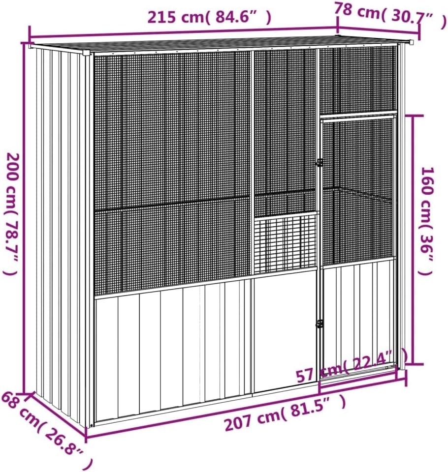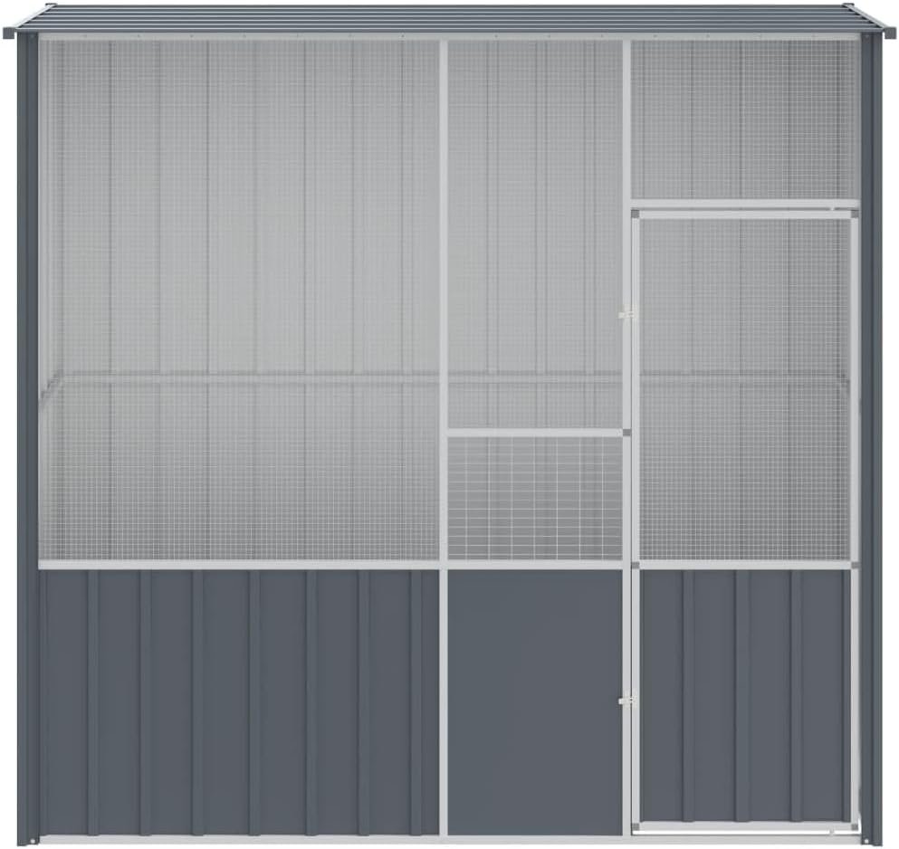 Diese Voliere bietet Ihren Vögeln einen gemütlichen und komfortablen Ort zum sicheren Fliegen und Spielen. Stabiler Rahmen: Dank der stabilen Konstruktion aus verzinktem Stahl ist dieses Vogelhaus auf Langlebigkeit ausgelegt. Geschweißtes Zaunelement: Die Voliere ist mit einem geschweißten Zaunelement ausgestattet, das Unheil und unerwartete Unfälle verhindert. Darüber hinaus können Sie Ihre Vögel täglich beobachten, während die Vögel ein weites Sichtfeld und viel frische Luft genießen. Große Bewegungsfreiheit: Die Voliere bietet Ihren Vögeln viel Bewegungsfreiheit zum Laufen, Spielen und Herumfliegen. Es ist auch für andere Kleintiere wie Kaninchen, Enten, Hühner, Gänse usw. geeignet. Zusätzliche Sicherheit: Die abschließbare Flügeltür mit Riegel sorgt für zusätzliche Sicherheit und bietet Ihren Vögeln zusätzlichen Schutz.
