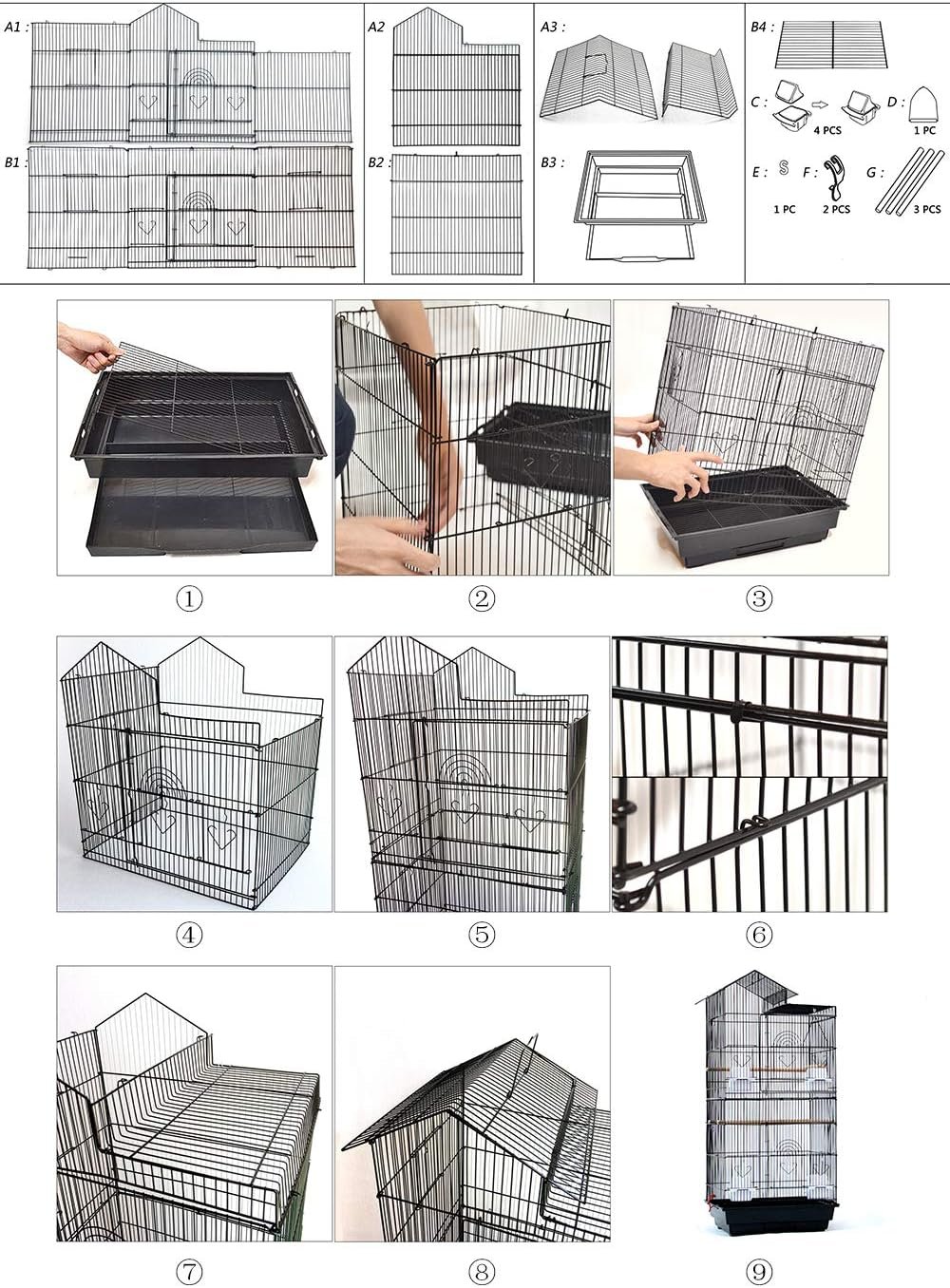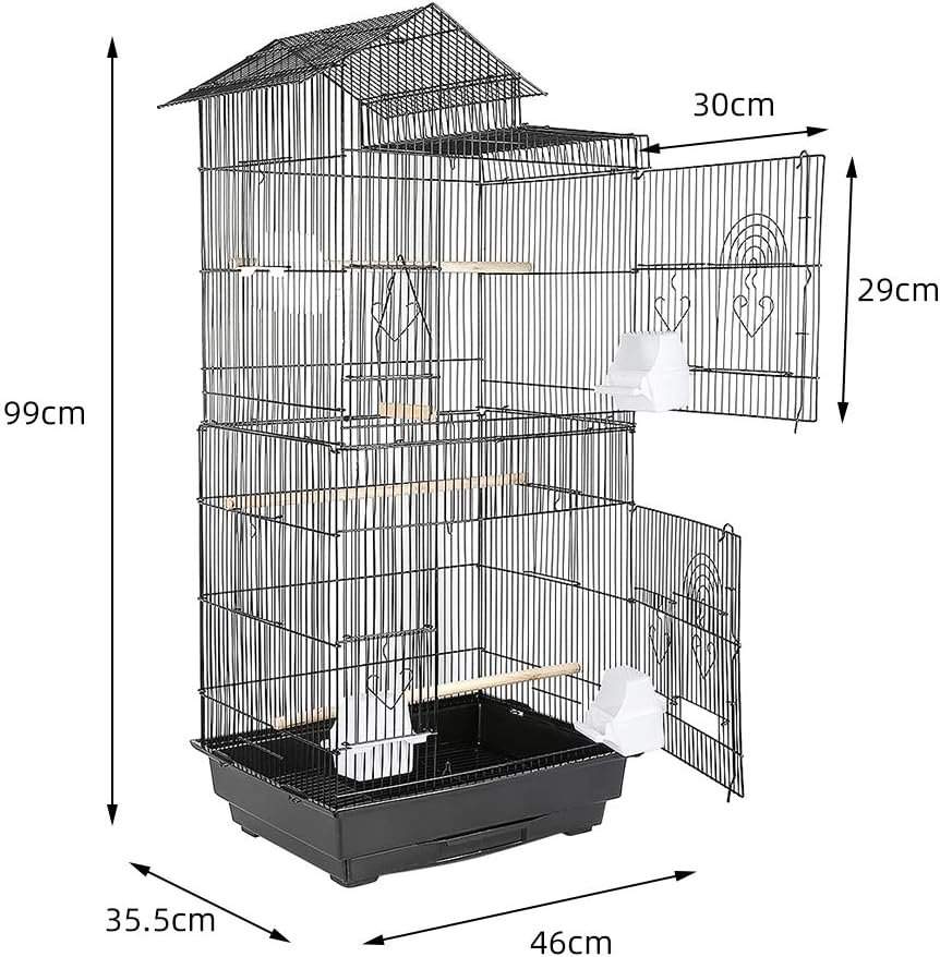 4) Produktarchitektur: Oben befindet sich ein stabiler Griff. Der vertikale Schaft an der Vordertür sorgt für zusätzliche Sicherheit und der Abstand zwischen den Eisenstangen beträgt 1 cm, um zu verhindern, dass Vögel zerbrochen werden. Die Regalseite ist geräumig, die Oberfläche ist pulverbeschichtet, rostfrei und alterungsbeständig, der Boden des Käfigs lässt sich leicht transportieren und die Rassen des Gestells können gereinigt werden.