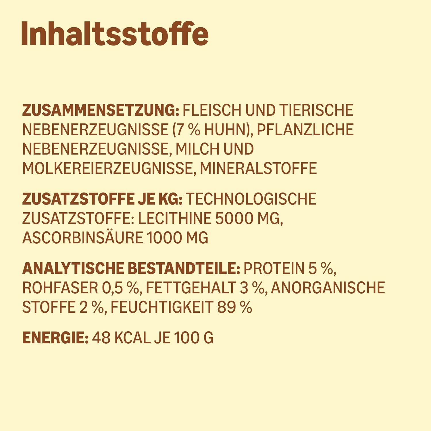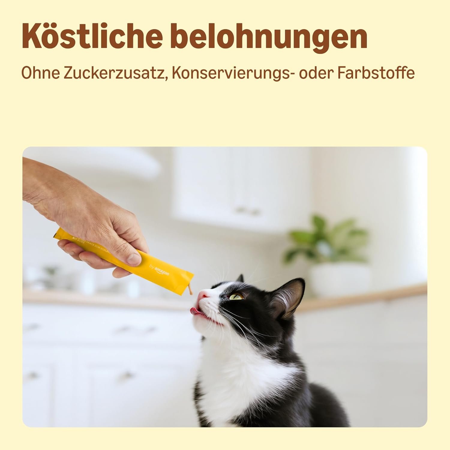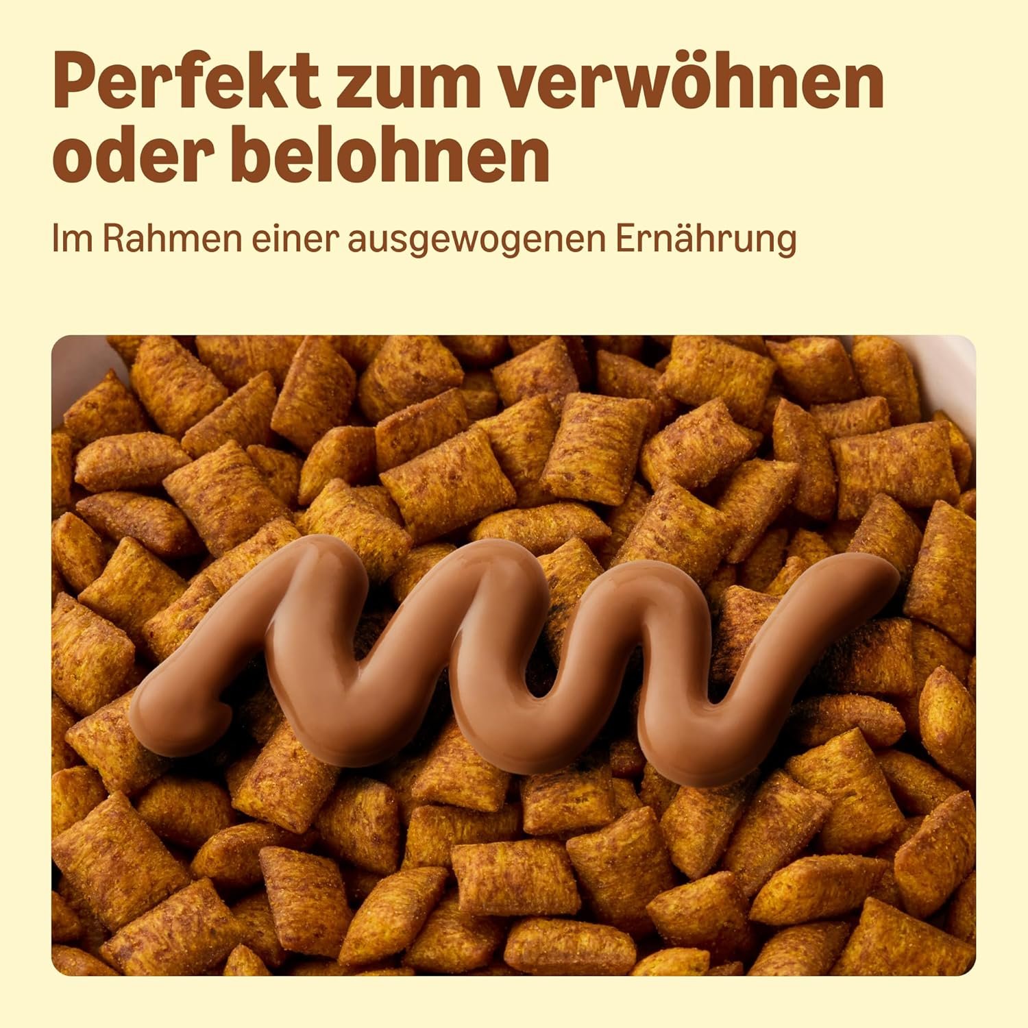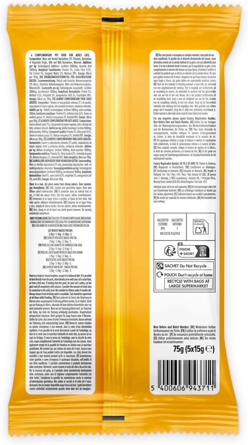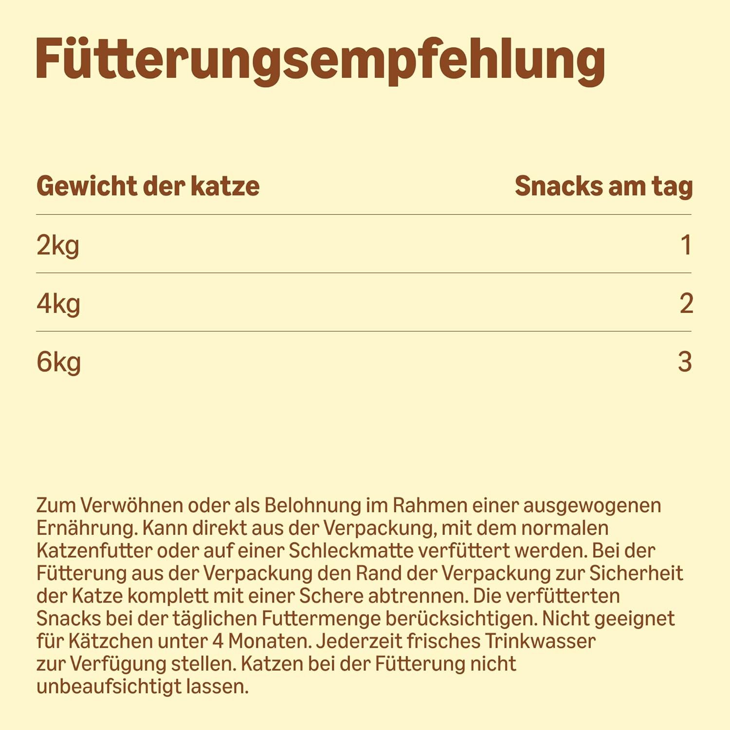 Füttern Sie es jederzeit als Belohnung oder Belohnung im Rahmen einer ausgewogenen Ernährung. Es ist möglich, direkt aus der Packung zu füttern, alternativ mit dem üblichen Futter Ihrer Katze oder von einer Leckmatte zu servieren. Wenn Sie aus der Packung füttern, schneiden Sie zur Sicherheit Ihrer Katze das Packungsende mit einer Schere vollständig ab. Beachten Sie die Menge an Leckereien, die auch mit dem täglichen Essen verbunden sind. Nicht für Kätzchen unter 4 Monaten geeignet. Stellen Sie stets sicher, dass frisches Trinkwasser zur Verfügung steht. Katzen sollten beim Füttern immer beaufsichtigt werden.