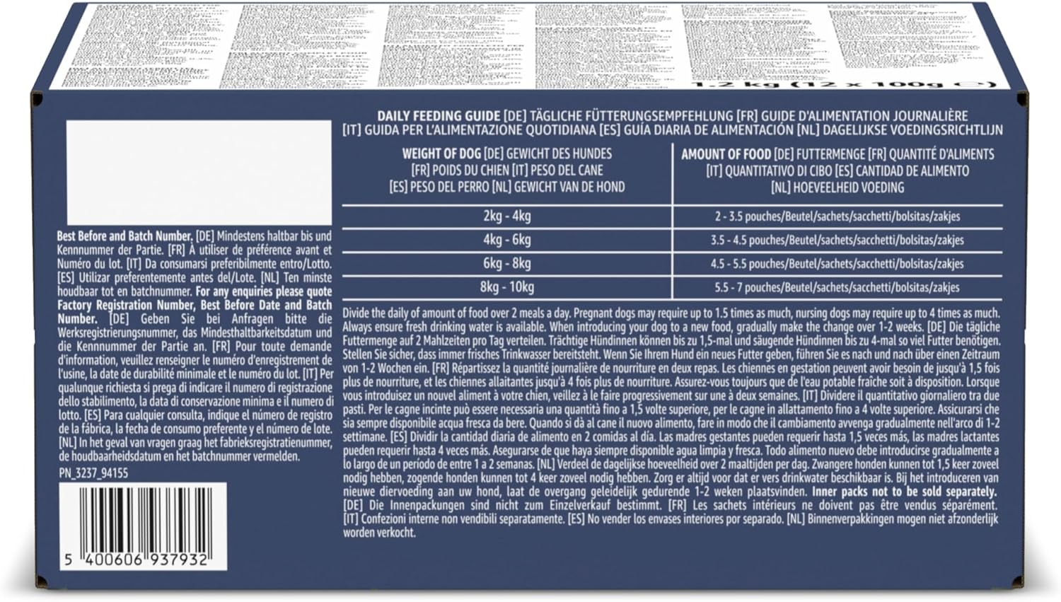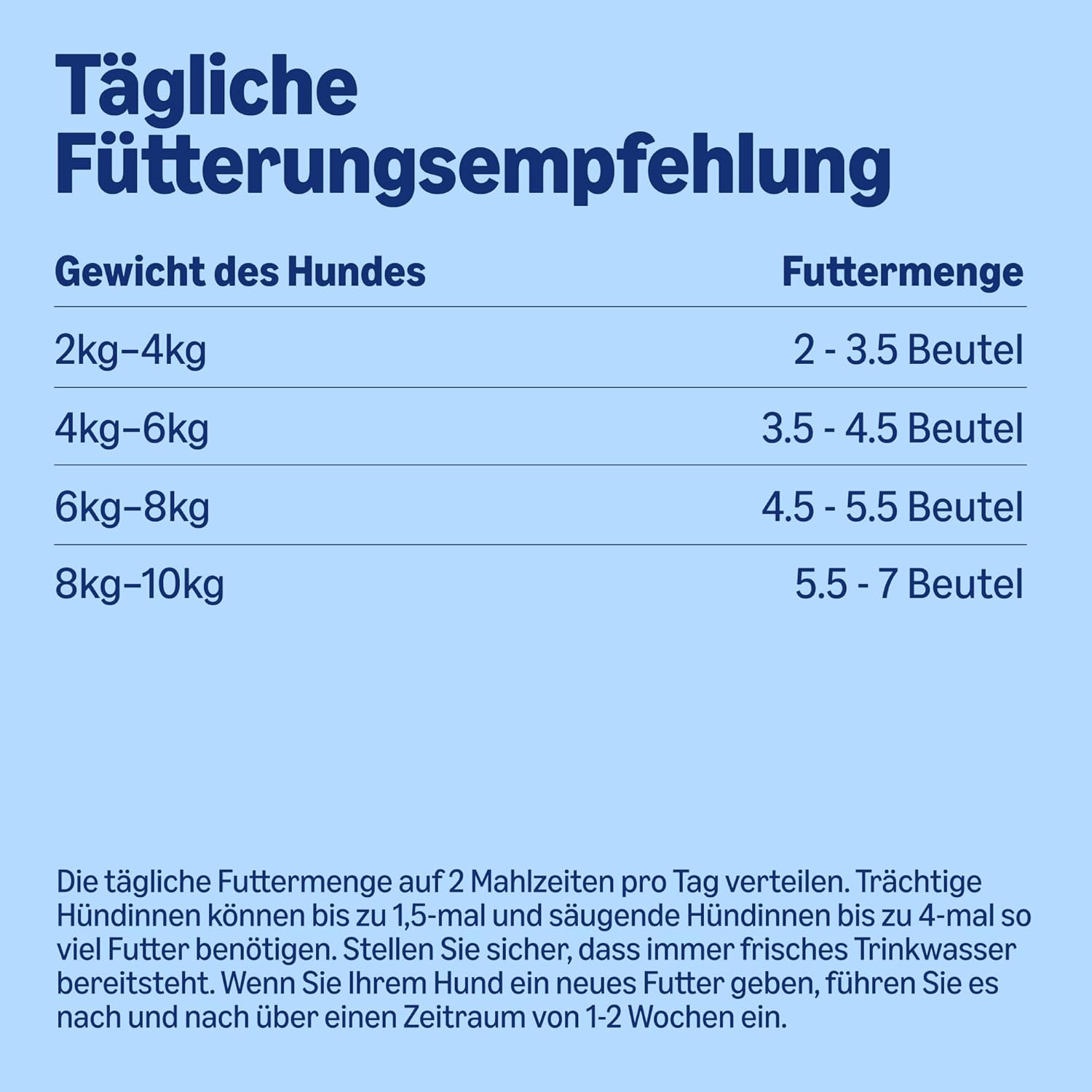 Sorgen Sie immer für frisches Trinkwasser. Wenn Sie Ihren Hund an ein neues Futter gewöhnen, führen Sie die Umstellung schrittweise über 1–2 Wochen durch.
