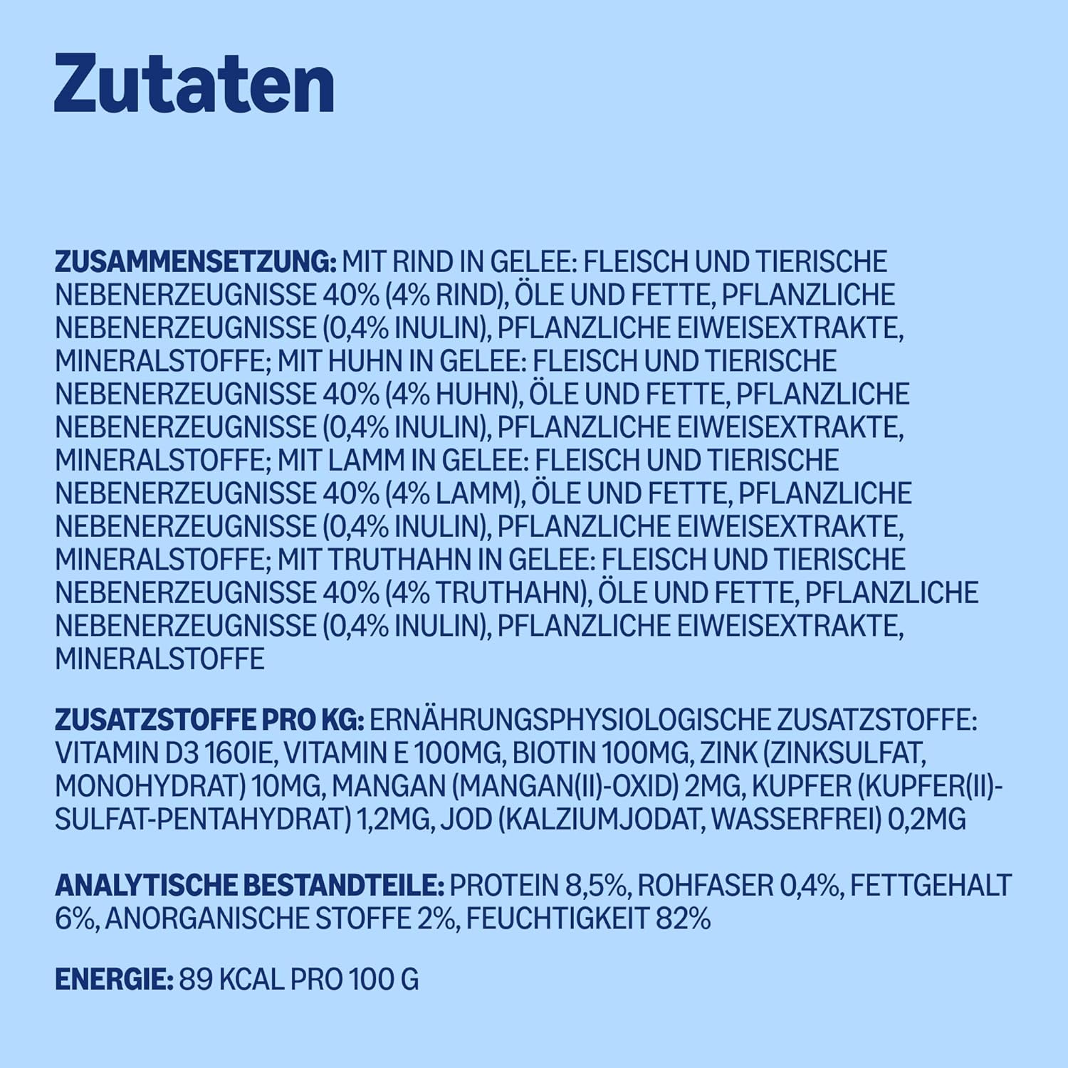 Fleisch und tierische Nebenprodukte mindestens 40 % (davon 4 % der jeweils genannten Proteine). Alle Fleischzutaten und Nebenprodukte stammen von Tieren, die für den menschlichen Verzehr geeignet sind