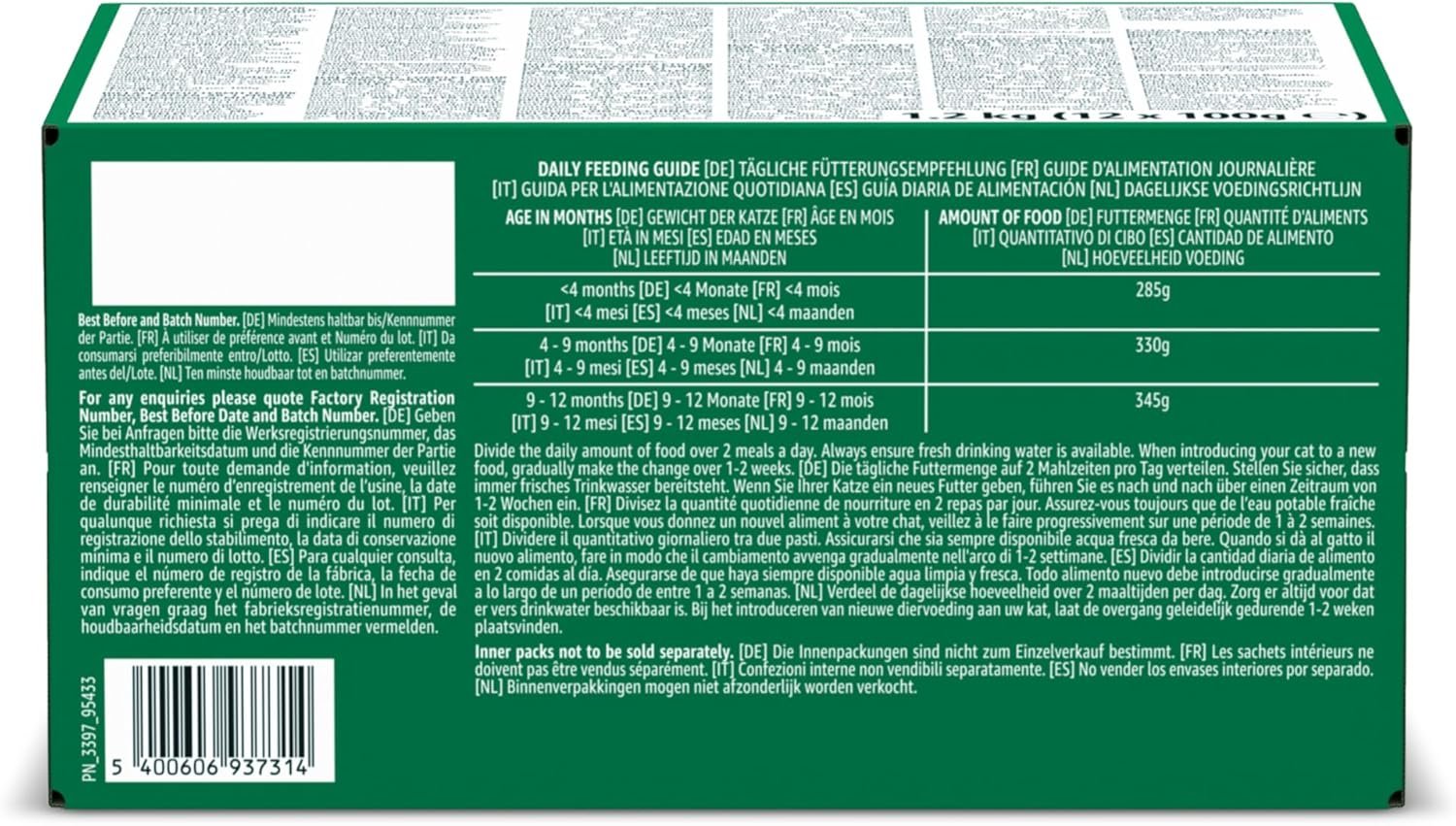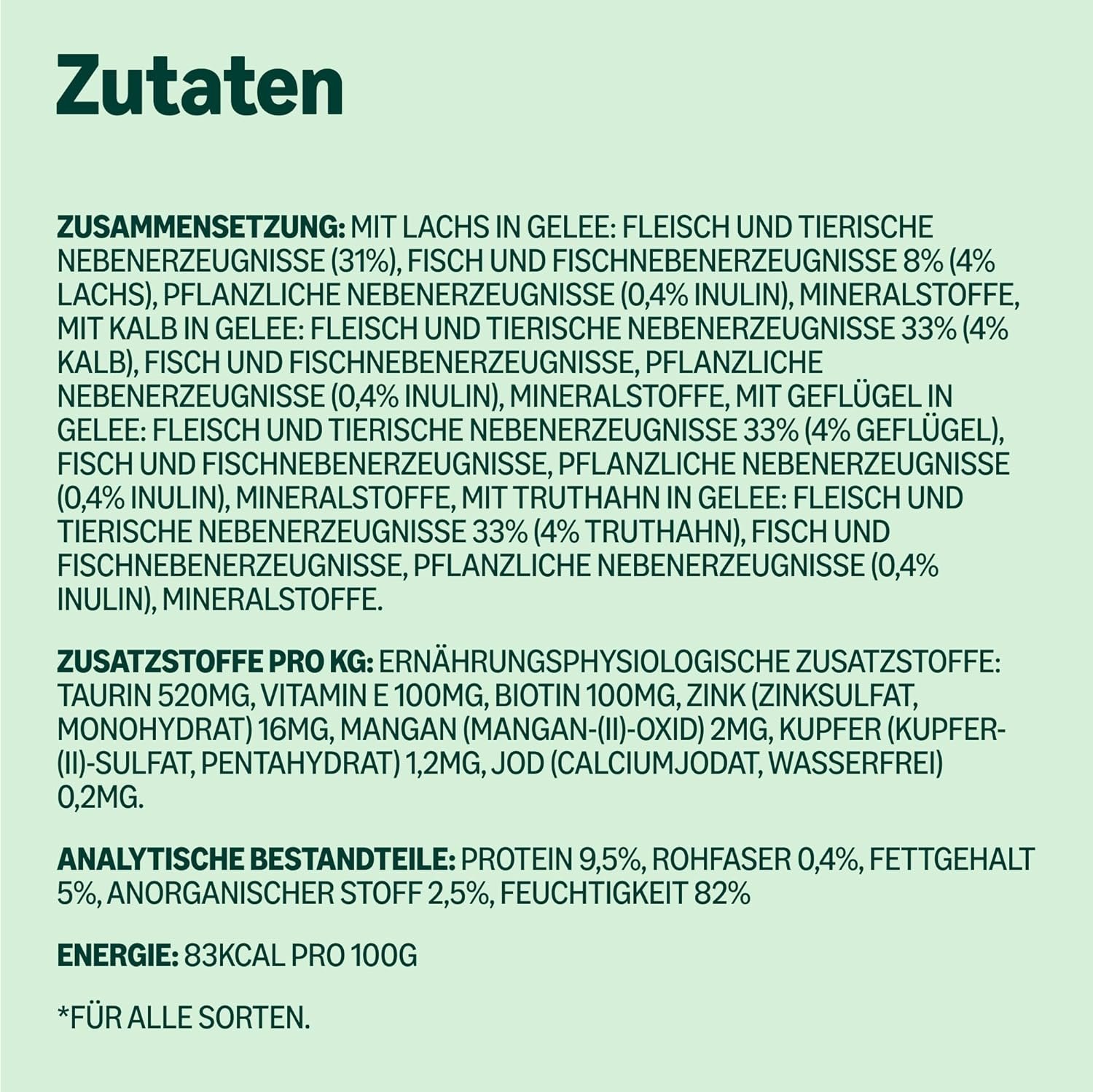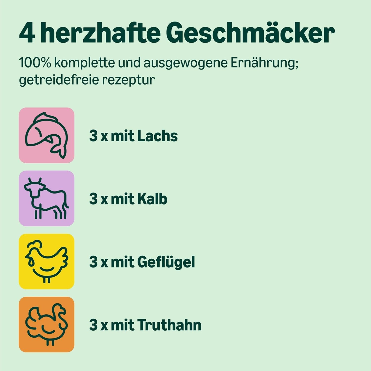 Packung enthält 12 Beutel: 3 x Lachs; 3 x mit Kalbfleisch; 3 x mit Geflügel; 3 x mit Truthahn
