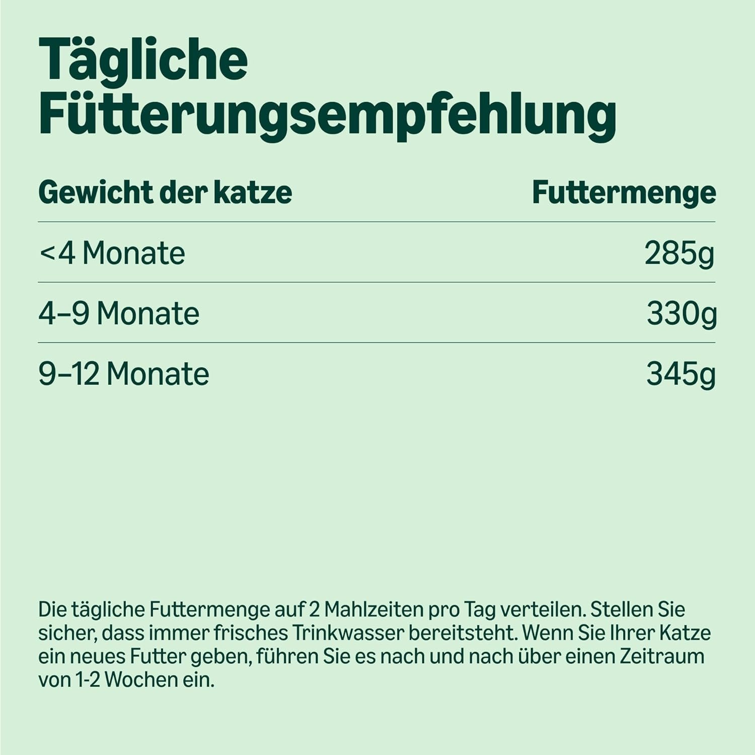 Verteilen Sie die tägliche Futtermenge auf 2 Mahlzeiten pro Tag. Stellen Sie sicher, dass immer frisches Trinkwasser zur Verfügung steht. Wenn Sie Ihrer Katze ein neues Futter geben, führen Sie es schrittweise über einen Zeitraum von 1–2 Wochen ein.