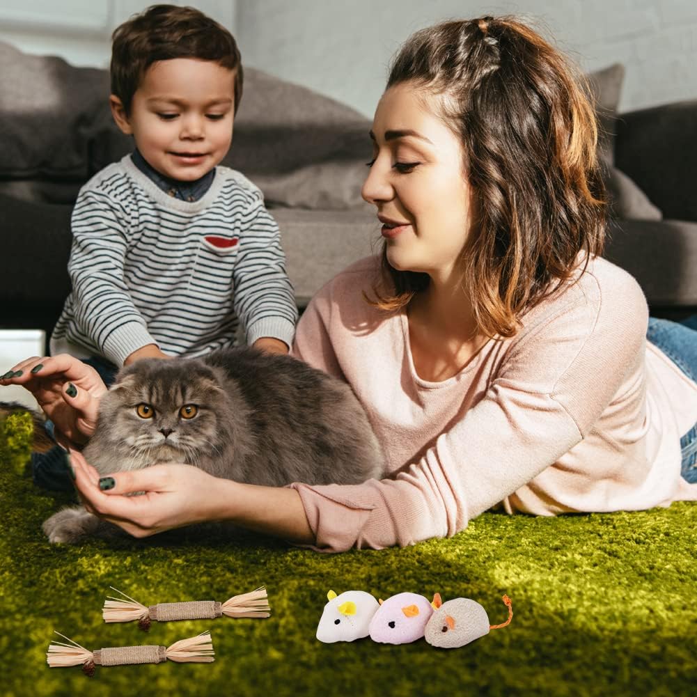 Natürliches Material: 6 Stück Katzenminze-Mausspielzeug, 2 Stück Kaustangen für Katzen, gezogen aus dem Material, das Katzen zum Spielen in der Natur lockt, Bastfaser und Polyethylenfaser, gefüllt mit Früchten zum Kauen von Früchten, Hanfseil befestigt, um das Spielzeug bissfester zu machen und Stress abzubauen, damit sich Ihre Katze ruhig und entspannt fühlt.