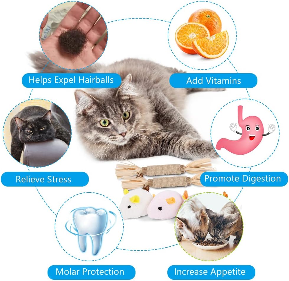 Natürliches Material: 6 Stück Katzenminze-Mausspielzeug, 2 Stück Kaustangen für Katzen, gezogen aus dem Material, das Katzen zum Spielen in der Natur lockt, Bastfaser und Polyethylenfaser, gefüllt mit Früchten zum Kauen von Früchten, Hanfseil befestigt, um das Spielzeug bissfester zu machen und Stress abzubauen, damit sich Ihre Katze ruhig und entspannt fühlt.