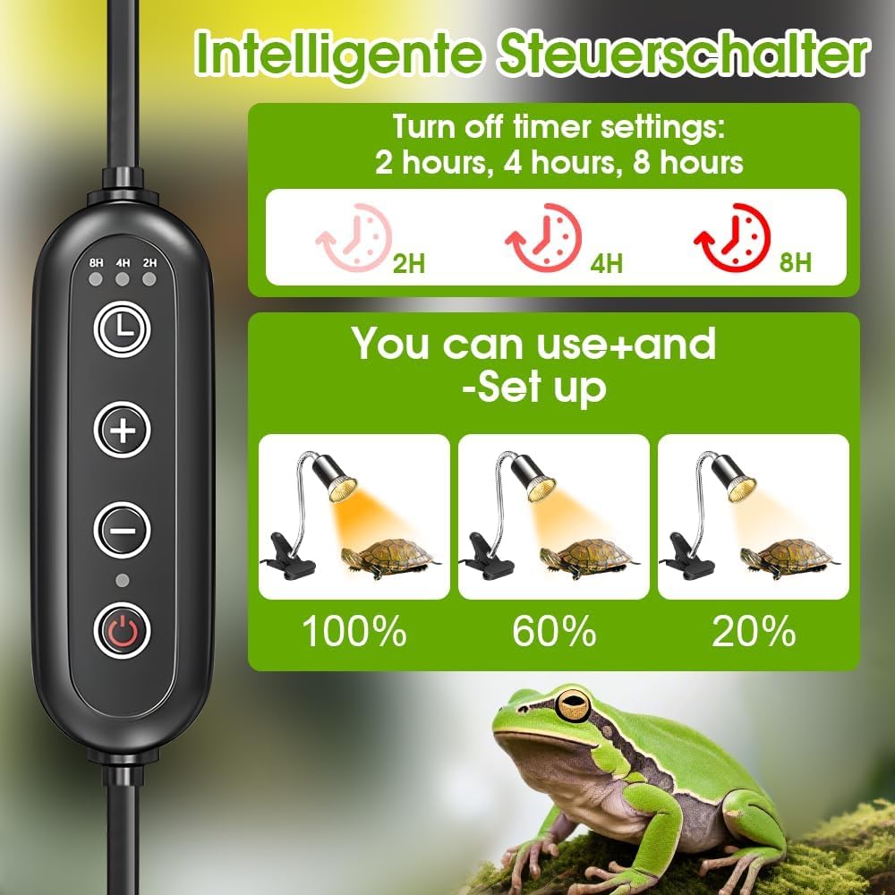 Timer- und Temperatursteuerung: Diese Reptilien-Heizlampe verfügt über ein innovatives, zyklisches Timing-Design mit drei praktischen Zeiteinstellungen (2H, 4H, 8H), mit denen Sie die Vorheizzeit einfach anpassen und eine stabile, angenehme Umgebung schaffen können. Drücken Sie einfach die +/- Taste, um die Helligkeit und Temperatur der Lampe an unterschiedliche Temperaturumgebungen anzupassen, um den Bedürfnissen Ihres Reptils gerecht zu werden.