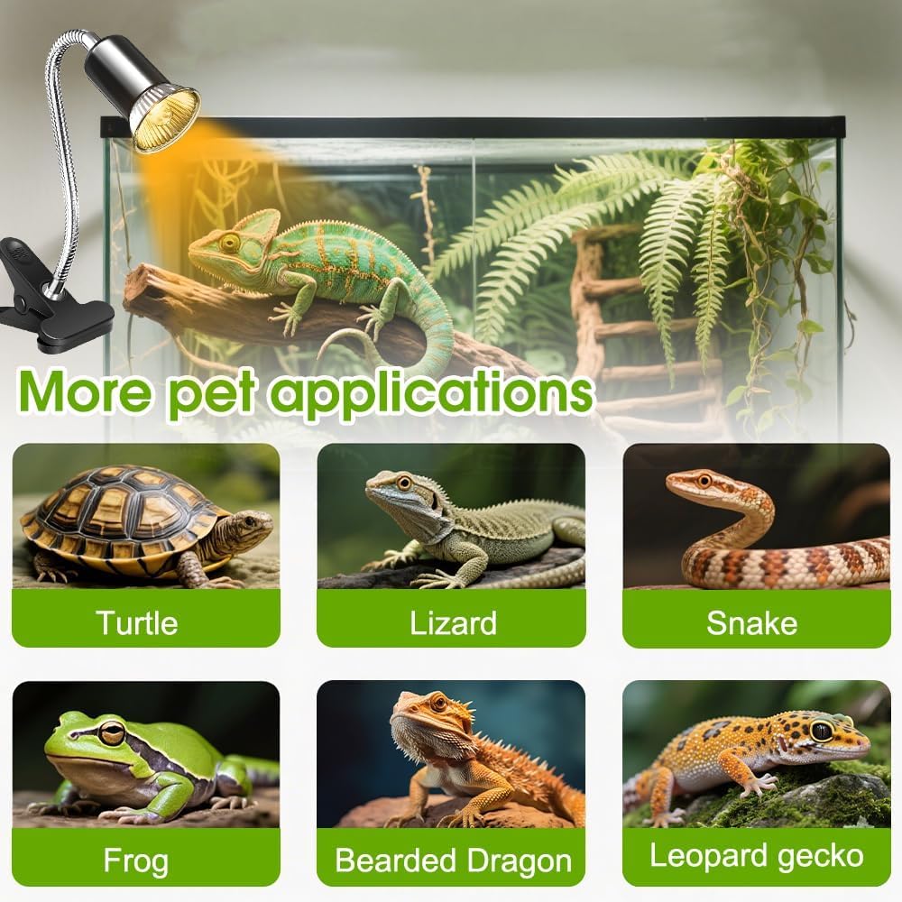 Breite Anwendung: Geeignet für alle Reptilien, die sich warm halten müssen, wie Schildkröten, Eidechsen, Bartagamen, Schlangen, Frösche, Leguane und viele mehr. Die Fassung ist auch mit anderen E27-Leuchtmitteln wie Leuchtstoff-, Glüh-, Keramik-, UV-, Halogen- und LED-Leuchtmitteln kompatibel.