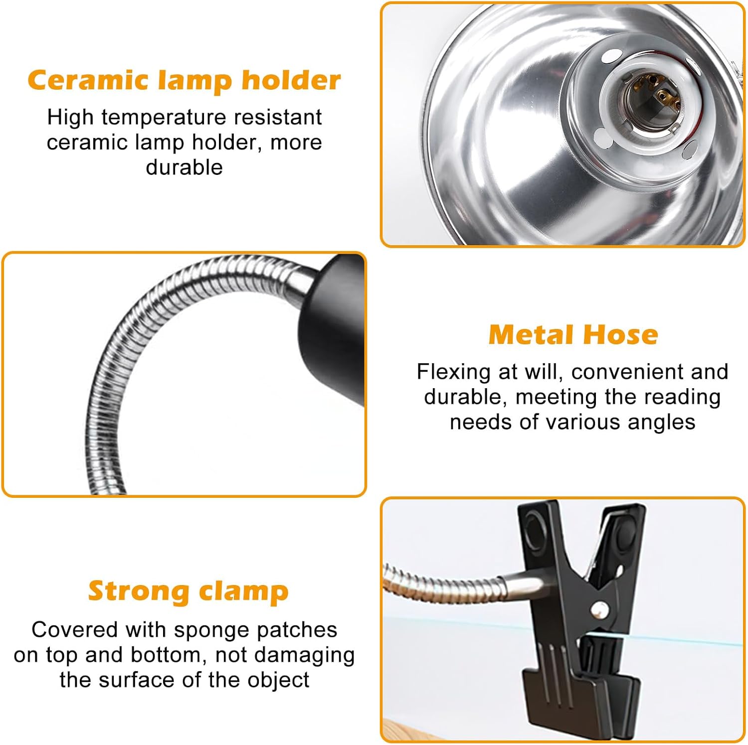 Anpassbares Design: Dank des anpassbaren Designs können die Wärmelampen-Schildkröten perfekt zur Steuerung von Helligkeit und Temperatur verwendet werden. Der Lampenkopf kann an die Bedürfnisse Ihres Haustieres angepasst werden. Durch die 360-Grad-Drehung können Sie die Richtung je nach Bedarf ändern. Der stabile Metallclip sorgt für eine einfache Befestigung an der Seitenwand eines Glasbehälters und gewährleistet eine einfache Installation und Anwendung.
