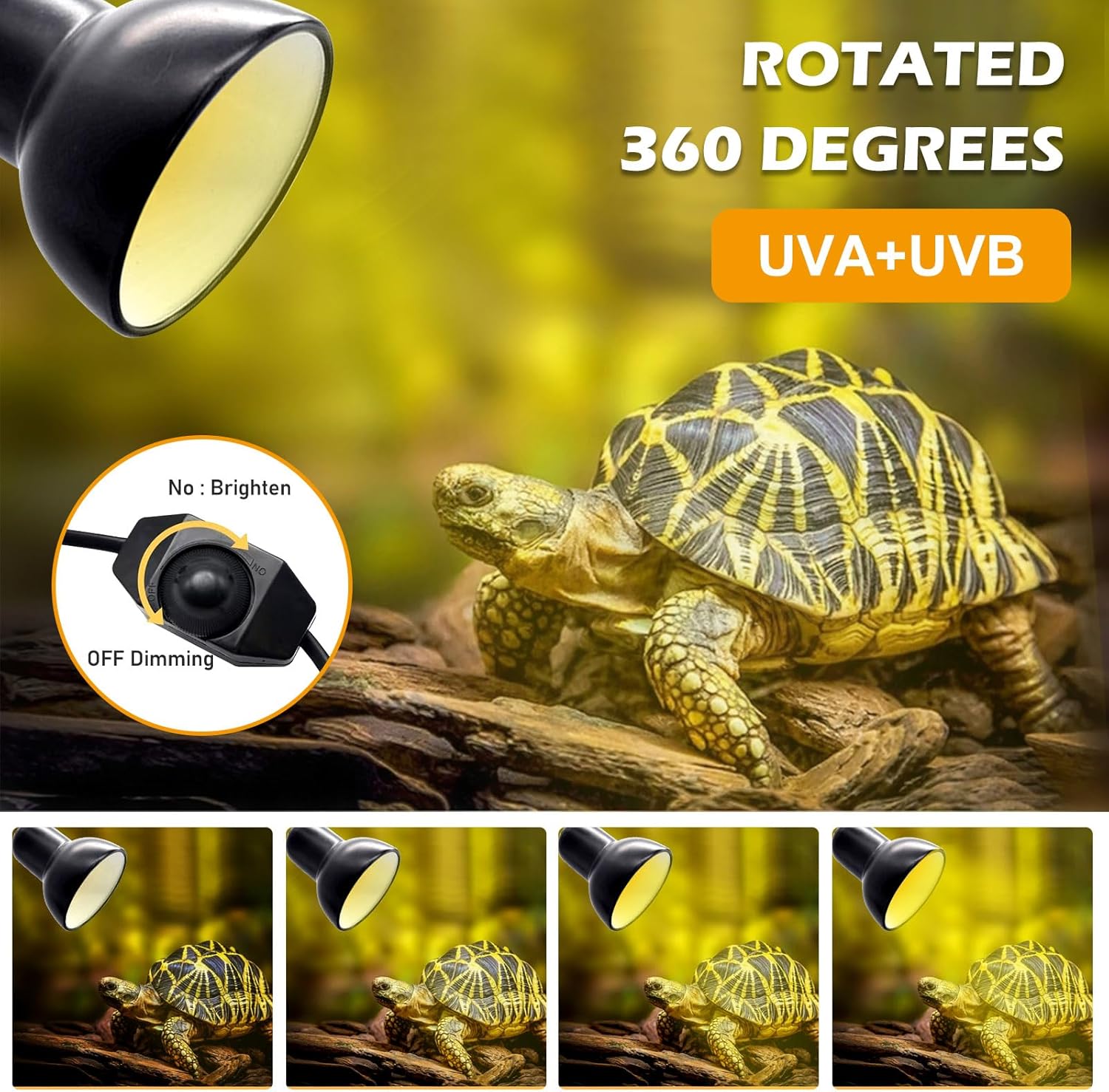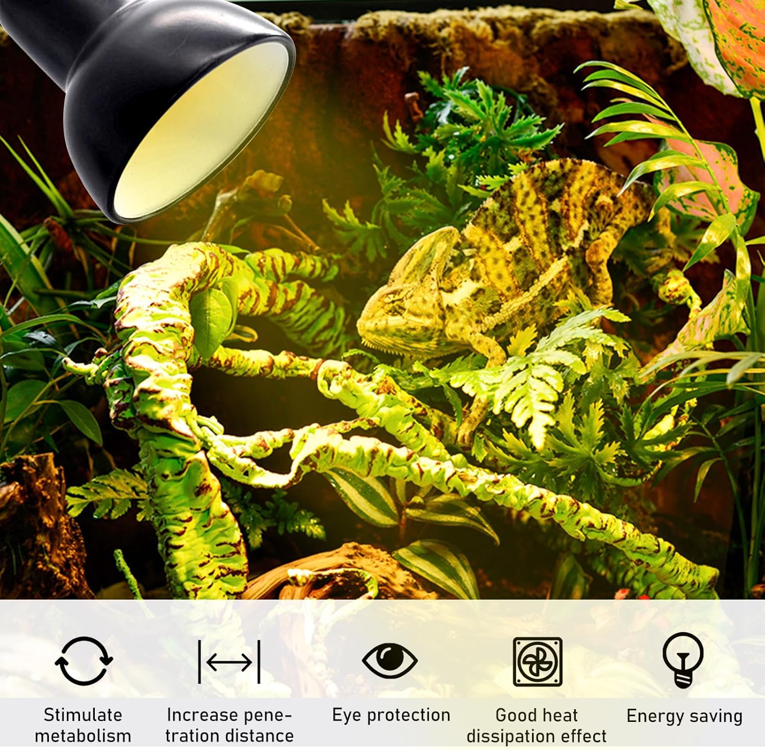 Schildkröten-Wärmelampe: Die Schildkröten-Wärmelampe ist eine 3-in-1-Lampe, die Sonnenlicht simuliert und gleichzeitig das UVA- und UVB-Spektrum ausstrahlt. UVA-Strahlen fördern das Appetitverhalten von Reptilien und unterstützen die Verdauung, um die Aktivität zu steigern. UVB-Strahlen fördern die Synthese von Vitamin D3 und die Aufnahme von Kalzium, was das Knochenwachstum und die Entwicklung von Reptilien unterstützt.