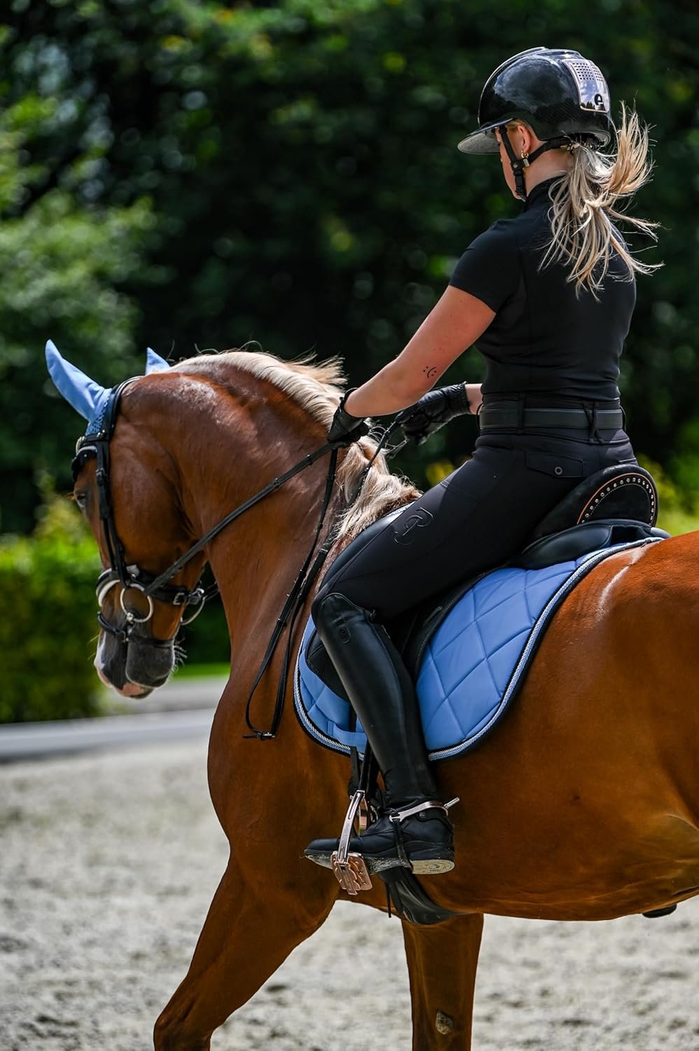4 cm. Größer als herkömmliche Schabracken. 3 kontrastierende Zierkordeln. Fliegenkappengröße WB. Eine anatomisch geformte Schabracke mit mittlerer Füllung. Optisch ein echter Hingucker durch kontrastierende Zierkordeln. Fliegenkappe mit exklusiven Strasssteinen. Material: 100 % Baumwolle. Schnüre: Polyester. Waschen: waschbar bis 30 °C. Fliegenkappe: Nur Handwäsche