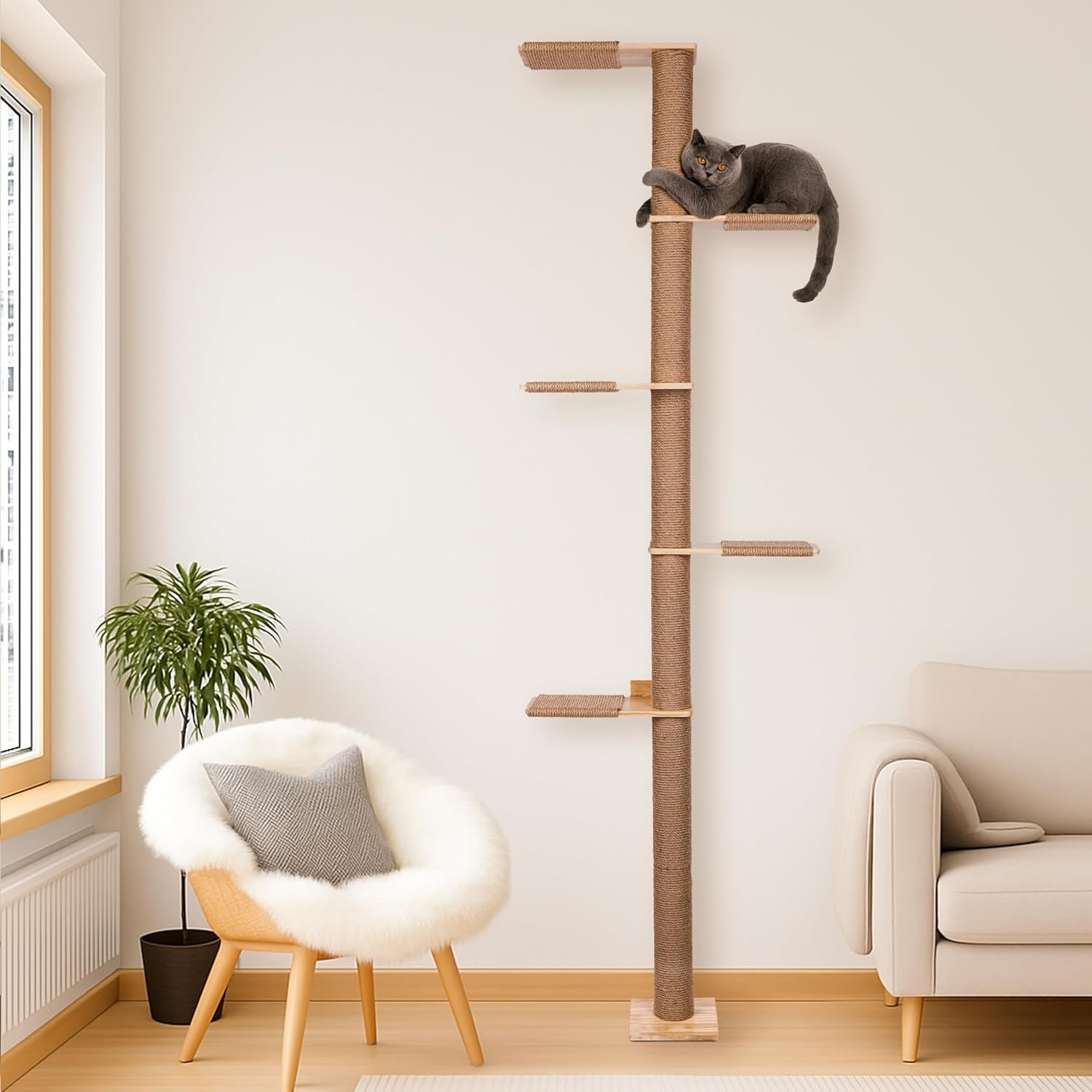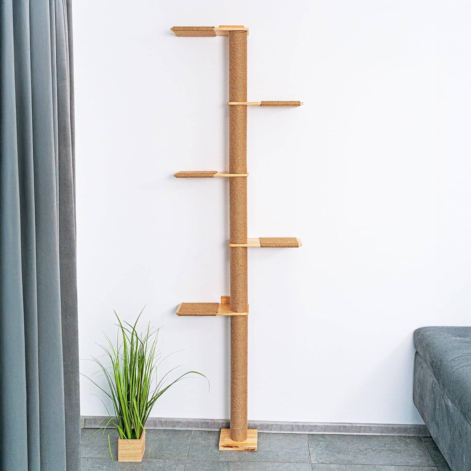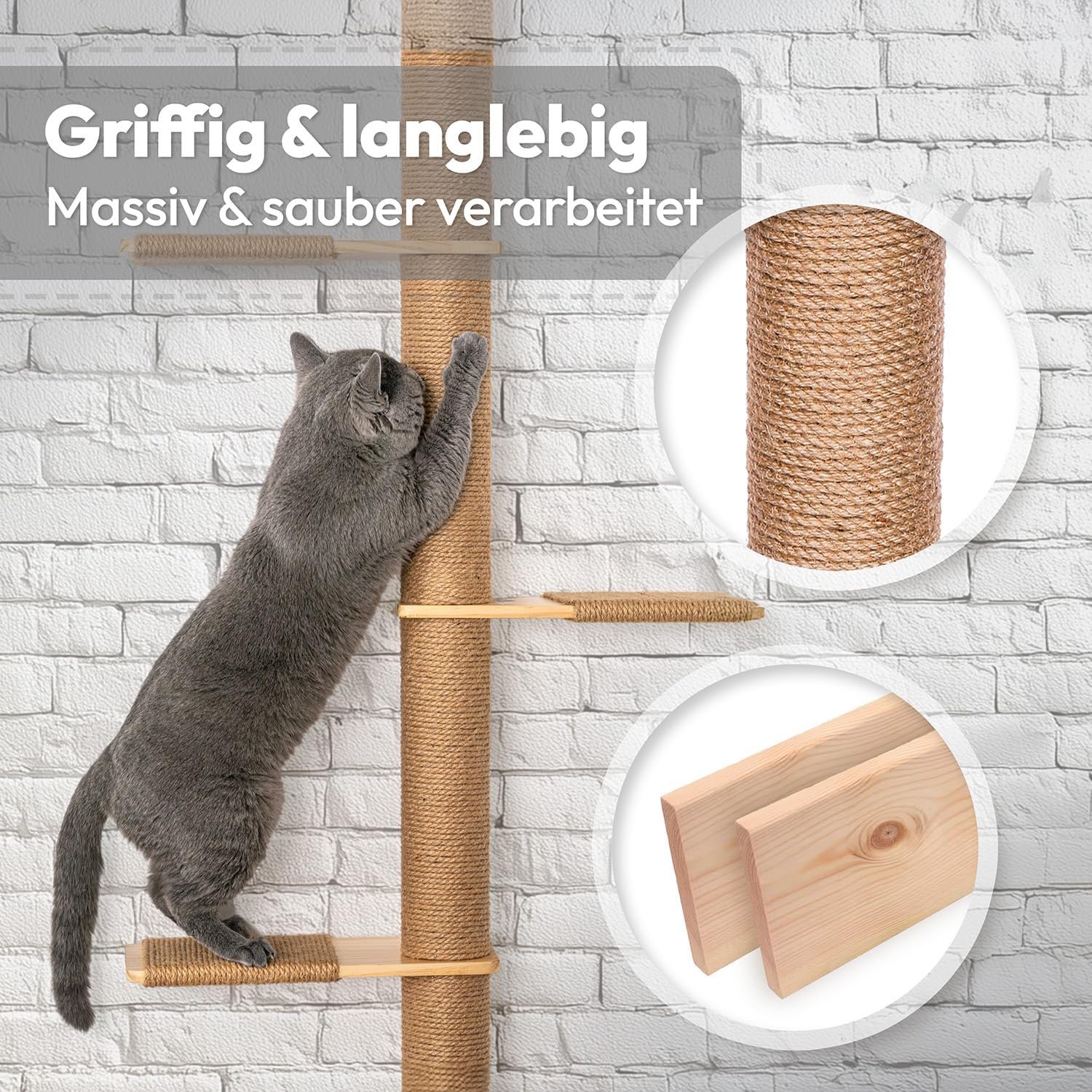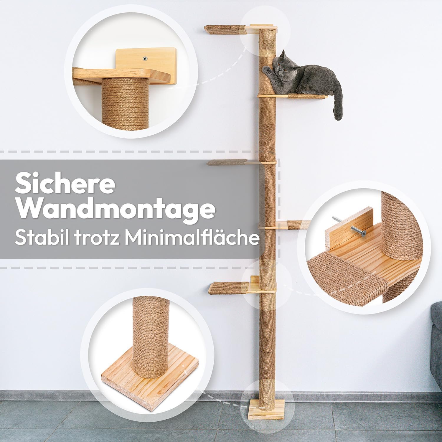 Flexibles Design mit drehbarer Kletterstruktur: Die Plattformen können unterschiedlich angeordnet und spiralförmig montiert werden, sodass eine individuelle Kletterwand für Katzen mit optimalen Sprungweiten entsteht. Dank der stabilen Wandmontage bleibt der große Kratzbaum auch beim wilden Spielen sicher und platzsparend. Ideal als deckenhoher Kratzbaum für maximale Bewegungsfreiheit.