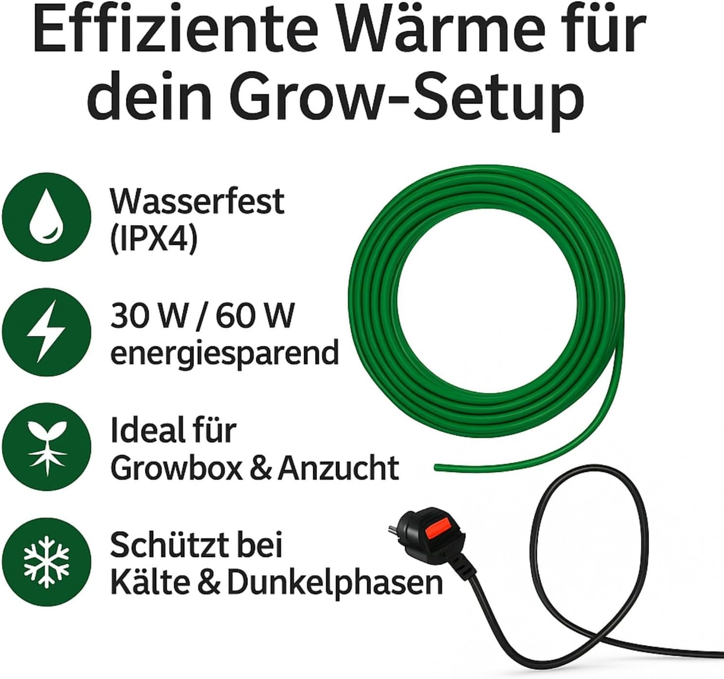 Grow-Heizmatte 60 W für Pflanzen 10 m – flexibel, langlebig, energiesparend Schaffen Sie mit der vielseitigen Grow-Heizung ideale Bedingungen für Ihre Pflanzen oder Haustiere. Diese 10 Meter lange, flexible Heizmatte verteilt 60 Watt Leistung gleichmäßig und eignet sich für den Garten, Gewächshäuser, Terrarien und Kleintierkäfige. Es ist auf Benutzerfreundlichkeit und effiziente Wärmeabgabe ausgelegt und versorgt Ihre Pflanzen und Haustiere mit der Wärme, die sie benötigen.