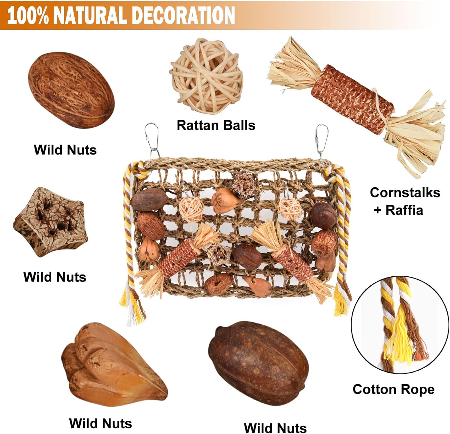 Einzigartiges Design: Diese Kauspielzeuge für Sittiche bestehen zu 100 % aus natürlichem Sisalseil, Maiskolben, Holzklötzen, Nüssen und Rinde ohne Pigmente, was sicher, umweltfreundlich und langlebig ist. Ihr Haustiervogel kann ohne Sorgen damit spielen, was sehr sicher ist. Erregen Sie in kurzer Zeit die Aufmerksamkeit des Papageis. Lassen Sie Ihren Papagei klettern und erkunden