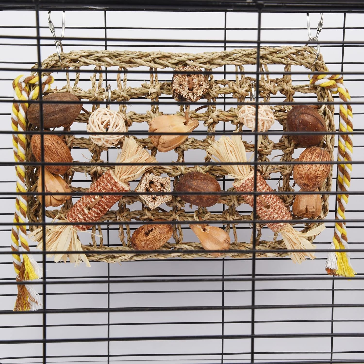 Einfach zu installieren und am Vogelkäfig aufzuhängen. Spielzeug-Vogelkäfige können Platz sparen und Vogelkäfige dekorieren.