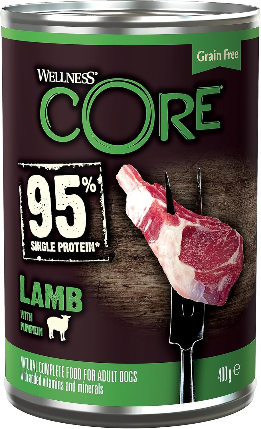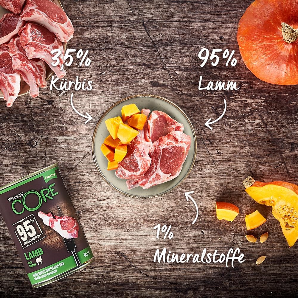 Dieses Produkt enthält 6 Dosen à 400 g Wellness CORE 95 % Lamm & Kürbis (Lamm & Kürbis). Fütterungsinformationen auf der Verpackung; bestes Futter bei Zimmertemperatur; Speisereste kühl lagern
