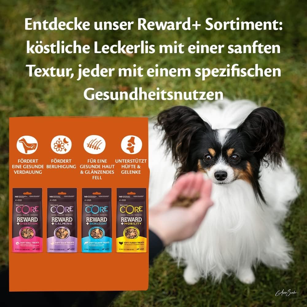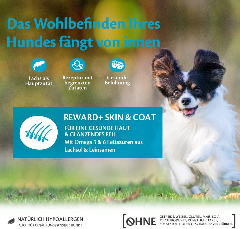 Ein natürlich hypoallergenes Rezept ohne Zusatz von Zucker, Getreide, Weizen, Gluten, Mais, Soja, Milchprodukten, Eiern, künstlichen Farbstoffen, Aromen oder Konservierungsstoffen; Ergänzungsfuttermittel für erwachsene Hunde aller Rassen ab 12 Monaten