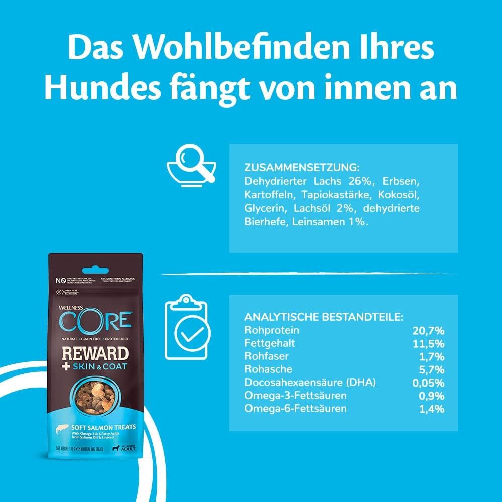 Frischer Lachs als Hauptzutat macht jeden Bissen köstlich; Diese getreidefreien Belohnungen sind dank der begrenzten Anzahl an Zutaten perfekt für Hunde mit empfindlichem Magen; kohlenhydratarme Hundekekse ohne Füllstoffe und ohne Zuckerzusatz