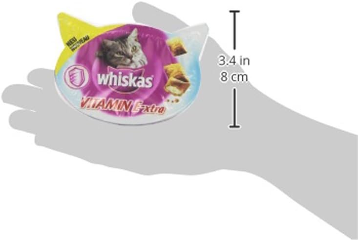 Whiskas Vitamin E-XTRA hilft Ihnen bei der Pflege Ihrer Katze – denn die leckeren Leckerbissen mit den beiden Texturen helfen Ihrer Katze, ihre natürlichen Abwehrkräfte zu stärken. Whiskas Vitamin E-XTRA enthält mit Vitamin E und Taurin zwei Inhaltsstoffe, die nachweislich zur Stärkung der natürlichen Abwehrkräfte von Katzen beitragen. Erhältlich mit leckerem Hühnerfleisch – purer Genuss für den Katzengaumen. Fütterungsempfehlung: 11 Stück täglich verfüttern. Nach dem Öffnen innerhalb von 4 Wochen verbrauchen. Reduzieren Sie die Vollwertkost entsprechend. Eine zusätzliche Schüssel mit frischem Trinkwasser sollte immer bereitstehen. Bitte kühl und trocken lagern. Zusammensetzung: Getreide, Fleisch und tierische Nebenerzeugnisse (darunter 4 % Huhn, Öle und Fette, Milch und Milchprodukte, Mineralien, pflanzliche Nebenerzeugnisse. Zusatzstoffe pro kg: Antioxidantien/ernährungsphysiologische Zusatzstoffe: Vitamin A: 6715 IE, Vitamin D3: 741 IE, Vitamin E: 188 mg, Kupfersulfat-Pentahydrat: 20,8 mg, Mangan(II)-sulfat-Monohydrat: 43,3 mg, Kaliumjodid: 1,7 mg, Taurin. 2832 mg Zinksulfat-Monohydrat: 193 mg. Produktinformationen: Nahrungsergänzung (ME) kcal: 409,00 kcal/100 g. 20,00 % Rohasche/Anorganische Stoffe: 7,50 % Rohfasern.00 % Omega-3-Fettsäuren: – Omega-6-Fettsäuren: – Analytische Bestandteile (%): Protein: 23 / Fettgehalt: 20 / Anorganische Stoffe: 7,5 / Rohfaser 2 / Brennwert: 409 kcal/100 g