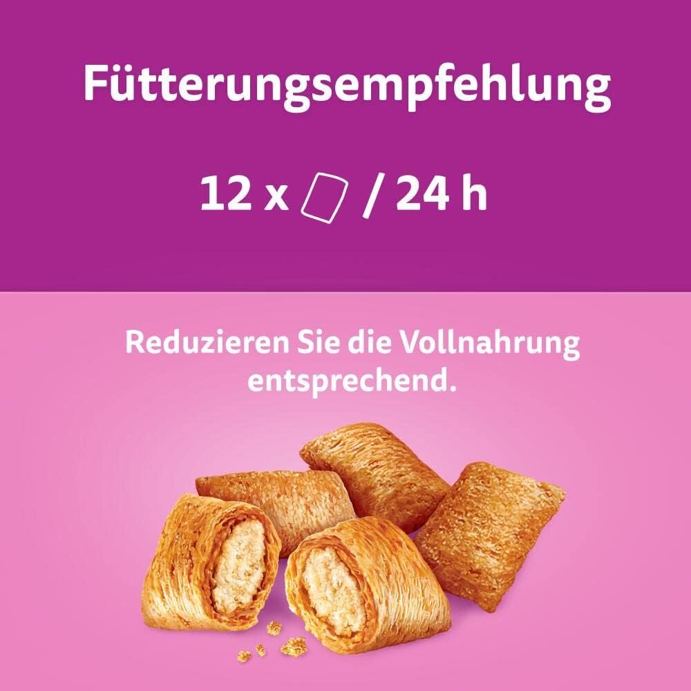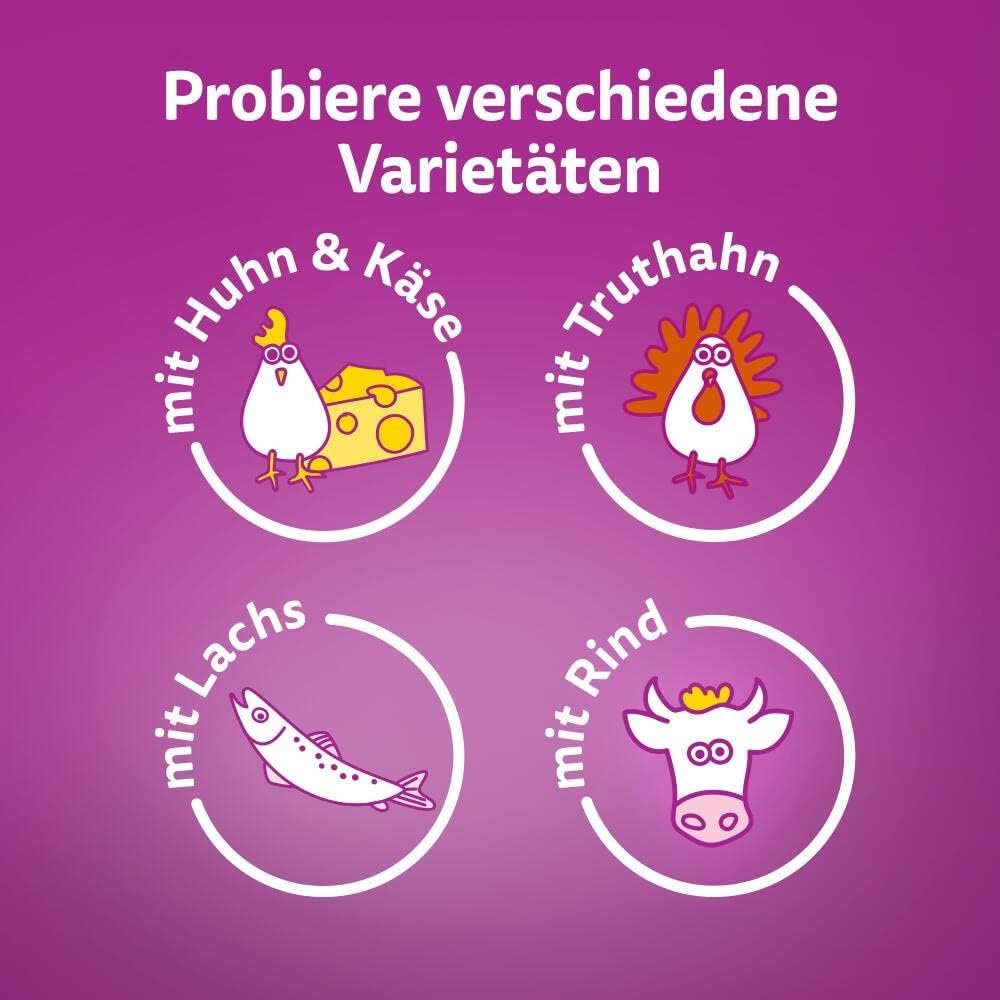 Katzensnacks in unwiderstehlichen Geschmacksrichtungen, darunter leckeres Huhn und Käse, mit Rind-, Lachs- und Truthahngeschmack – denn Katzen lieben Abwechslung