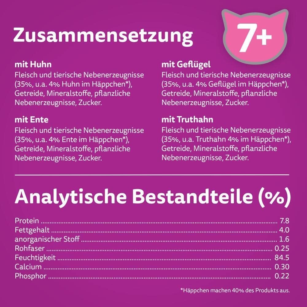 Jede köstliche Formel enthält 100 % hochwertige Zutaten und deckt alle täglichen Bedürfnisse Ihrer Katze ab 7 Jahren ab