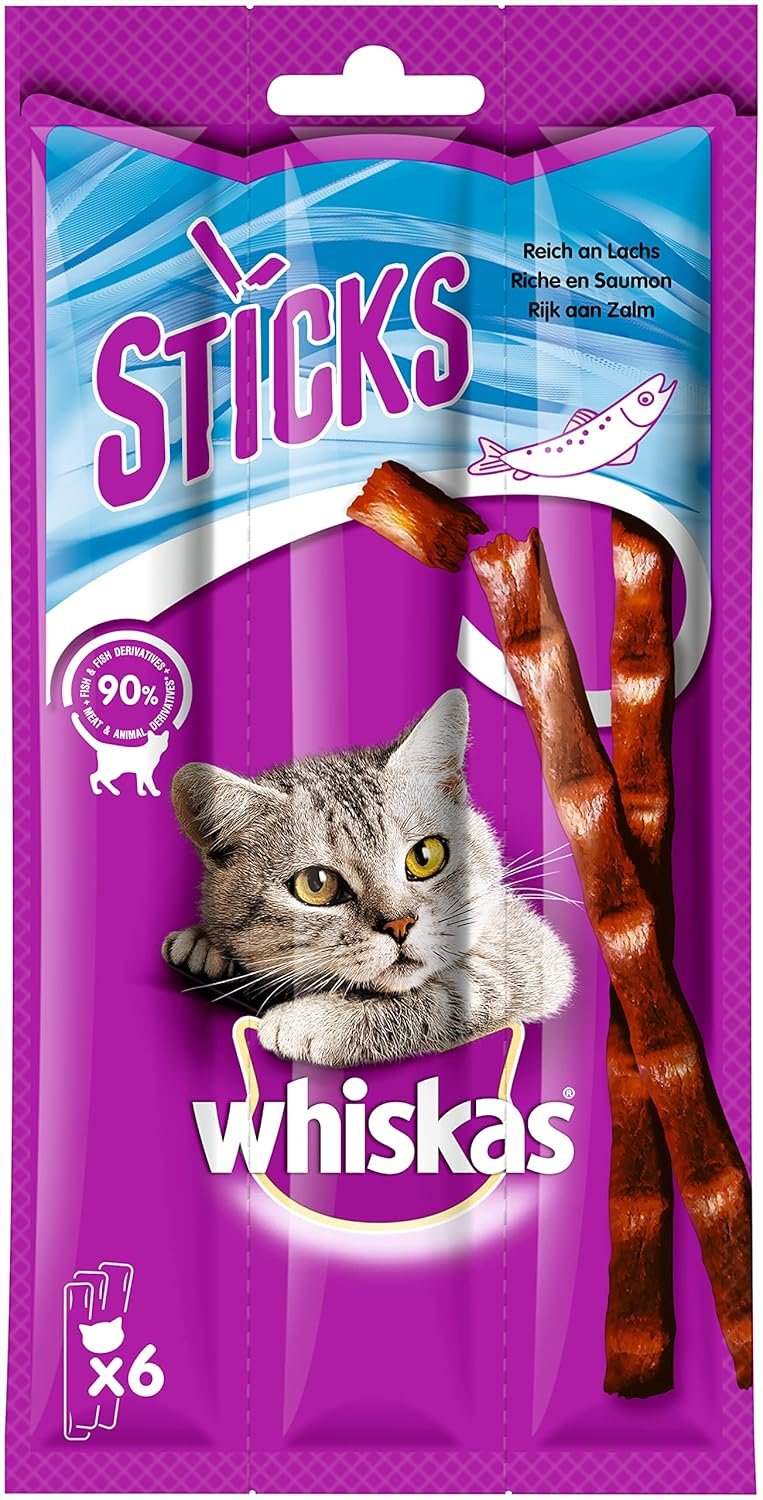 Inhalt: 14x 36 g Whiskas Sticks, 3 Sticks pro Packung, mit Lachsgeschmack, leckerer Kauspaß