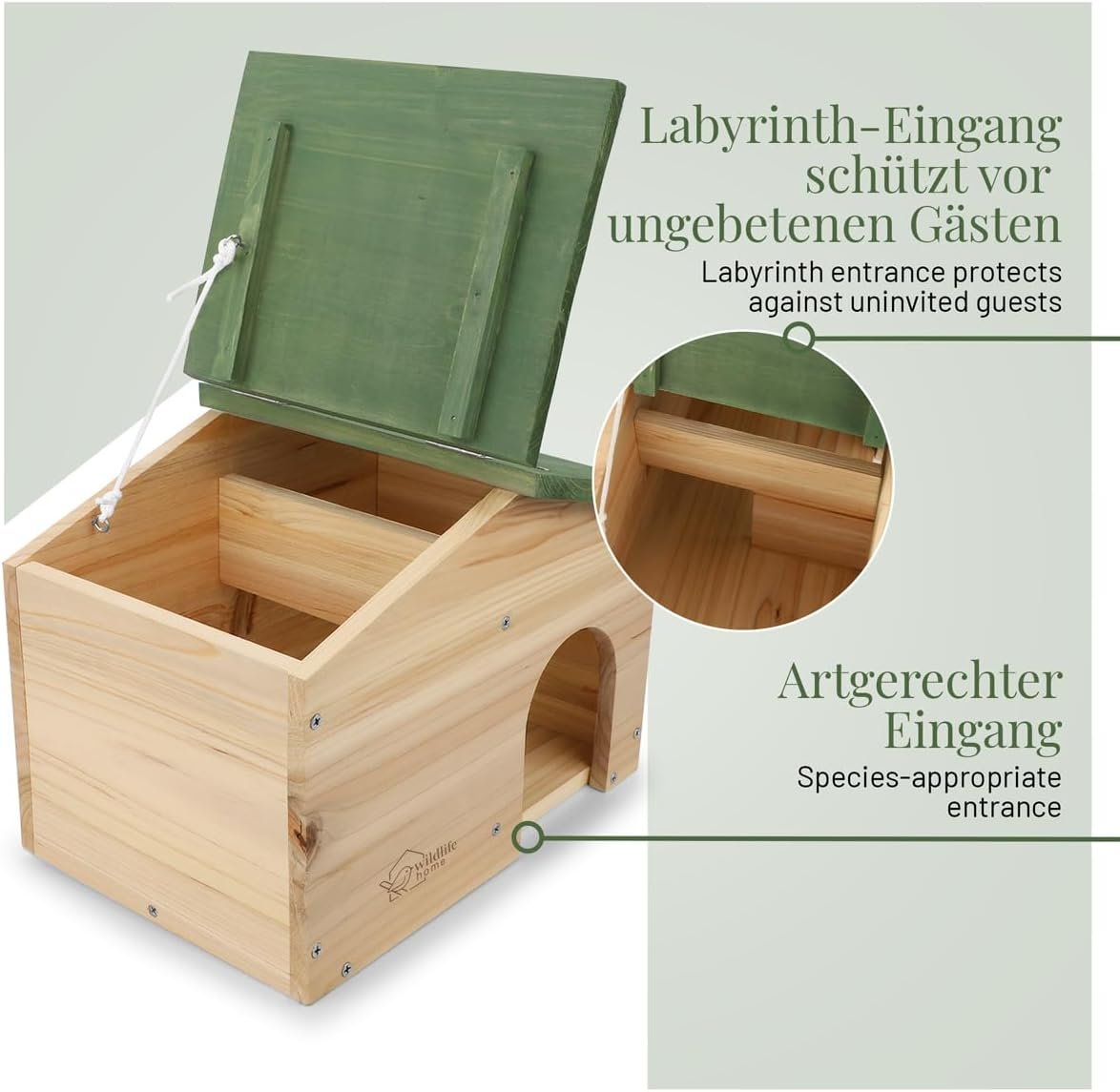 Hergestellt aus robustem Kiefernholz bietet unser WILDLIFE HOME Igelhaus einen sicheren Rückzugsort für Igel während ihrer Ruhezeiten. Dank seines aufklappbaren Satteldachs ist der Igel vor Regen und anderen Witterungseinflüssen geschützt. Der feste Boden aus stabilem Holz hält das Innere des Winterquartiers schön trocken und warm. Der artgerechte Labyrinth-Eingang dieses Igelhauses bietet zusätzlichen Schutz vor Katzen oder Füchsen, denn diese Fressfeinde haben keine Chancen in die Igel-Schlafkammer einzudringen. Zudem schützt die Labyrinth-Wand den Igel vor Zugluft und er kann sich bequem zurückziehen. Damit es im Haus schön kuschelig ist, kann es mit Reisig oder trockenem Laub befüllt werden.