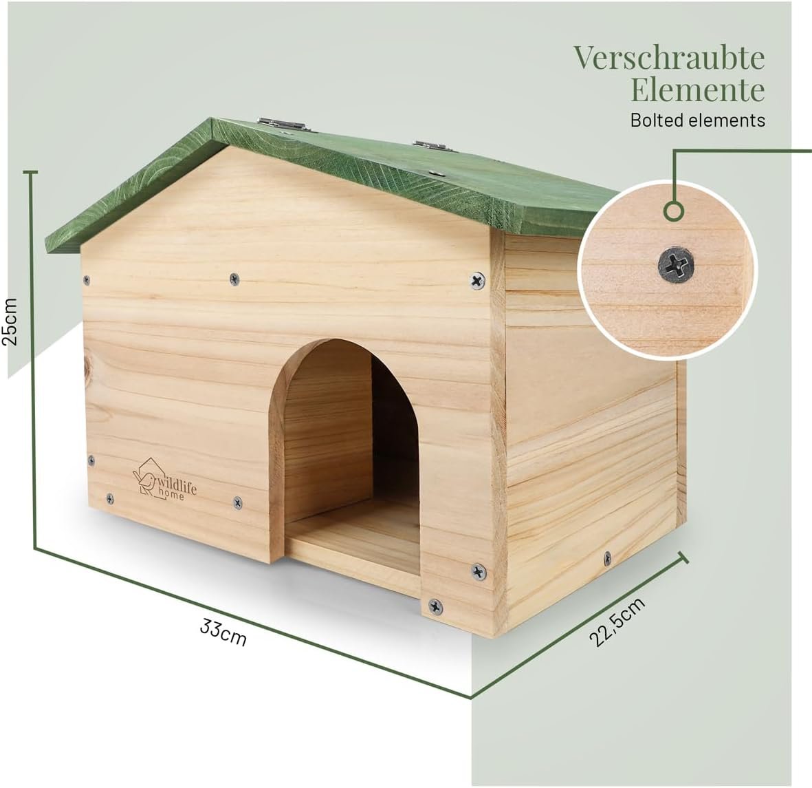 Produkt im Detail: Hergestellt aus Kiefernholz Wetterfestes Satteldach aus Holz Labyrinth-Eingang zum Schutz vor Feinden Aufklappbares Dach für eine leichte Reinigung Verschraubte Holzelemente gewährleisten ausreichend Stabilität Bausatz mit Aufbauanleitung & Schrauben Maße: 33 x 22,5 x 25cm (LxBxH)