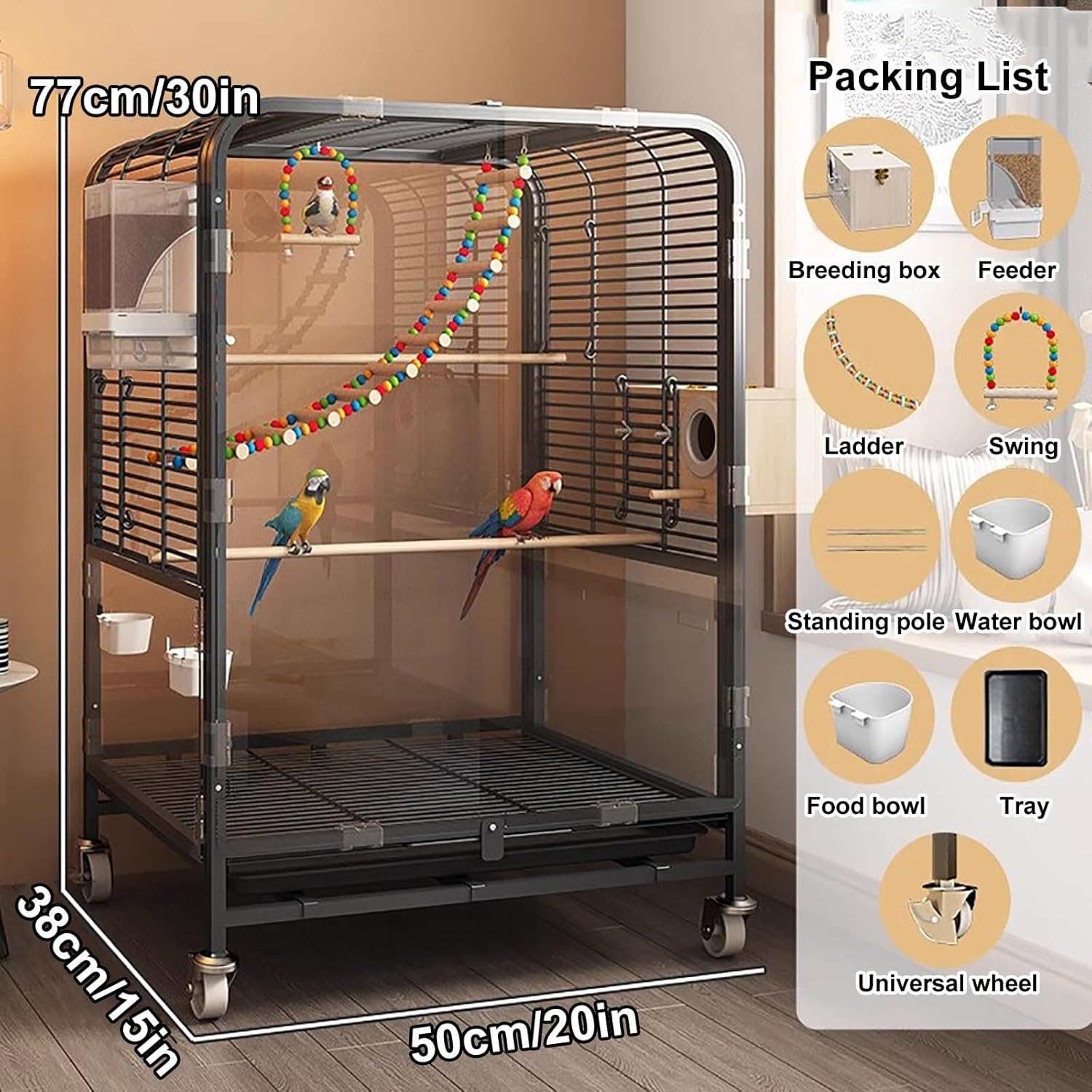 Dieser luxuriöse Vogelkäfig bietet nicht nur einen geräumigen Sitzplatz für Ihren geliebten Vogel, sondern kombiniert auch elegantes Design mit praktischen Funktionen. Mit einem stabilen Metallrahmen und transparenten Seitenwänden aus PP-Harz können Sie jede Bewegung des Vogels jederzeit problemlos beobachten. Ob funktional oder ästhetisch, dieser Vogelkäfig ist die ideale Wahl für die Sitzgelegenheiten für die Stubenvögel Ihrer Familie.