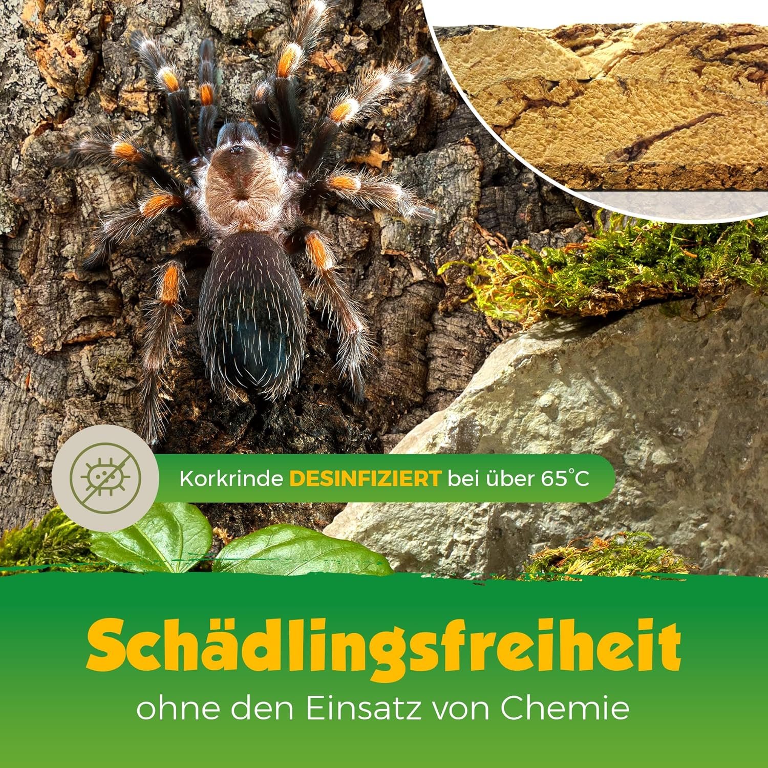 Naturkork, der nachwachsende und unbehandelte Rohstoff, eignet sich ideal als Verkleidung oder Rückwand im Käfig oder Terrarium. Garantiert desinfizierend und schädlingsfrei durch unbedenkliche Hitzebehandlung bei 65°C – ohne Chemie. Korkplatte für Terrarien (900 x 600 mm). Gepresste Kork-Trägerplatte, auf die sie unter hohem Druck aufgeklebt und verklebt wurden. Die Rückseite bietet einen glatten Untergrund zur einfachen Befestigung an der Wand oder dem Glas des Terrariums (Terrarienboden). Die natürlichen Korkteile sorgen für einen 3D-Effekt und ermöglichen das Klettern auf rauen und unebenen Oberflächen. Der Korkrücken wird unserer Wärmebehandlung bei 65 °C unterzogen und ist garantiert schädlingsfrei, ohne den Einsatz von Chemikalien oder gefährlichen Schadstoffen. Unsere Korkprodukte sind absolut sicher und Sie können Ihr Haustier sorgenfrei genießen.