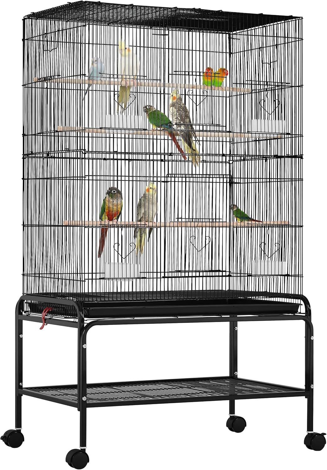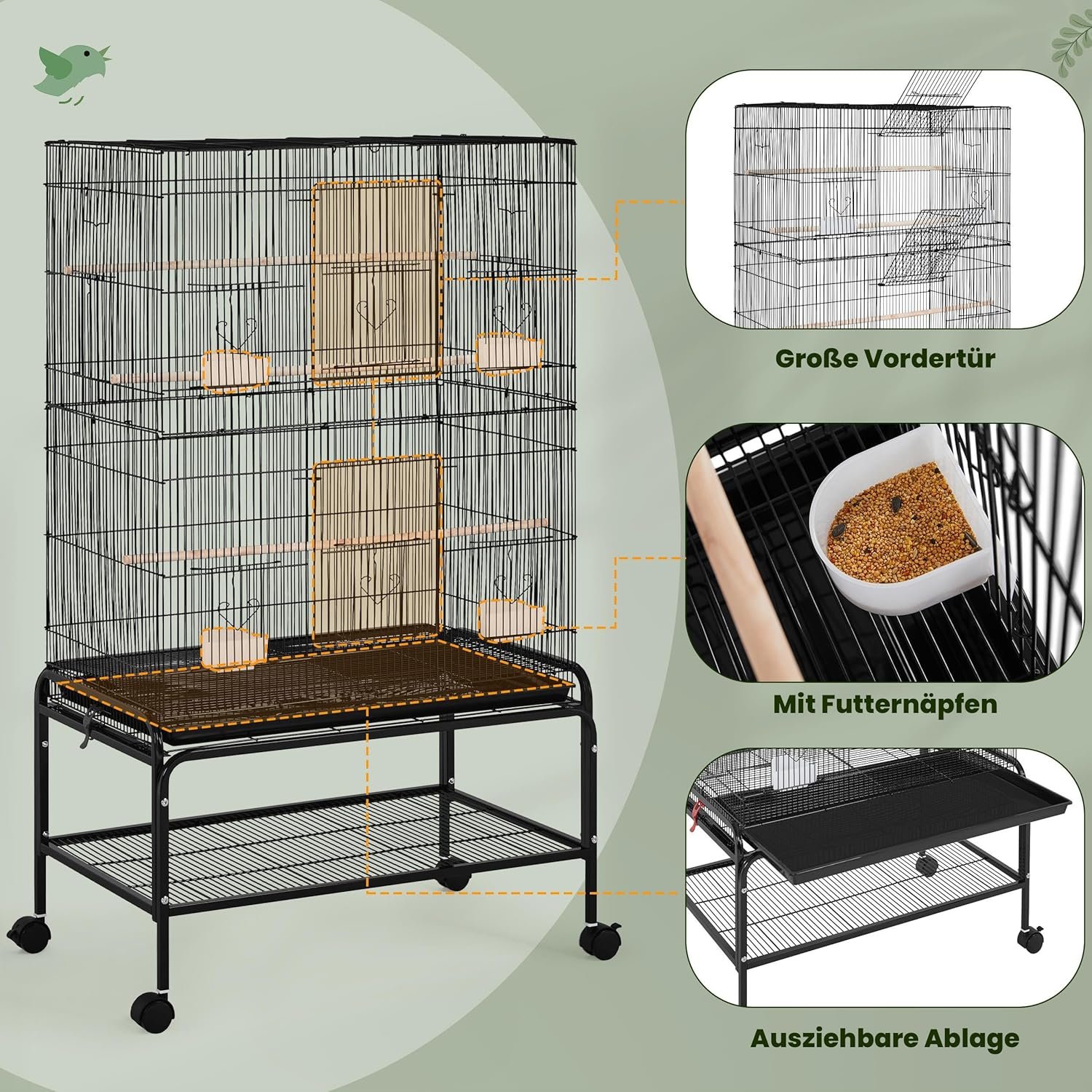 GROSSER VOGELKÄFIG – Mit der Größe von 76 cm L × 45 cm B × 92 cm H ist dieser Käfig ideal für kleine und mittelgroße Vögel wie Sittiche, Wellensittiche, Turteltauben und dergleichen. Darüber hinaus gibt es einen abnehmbaren Rollständer