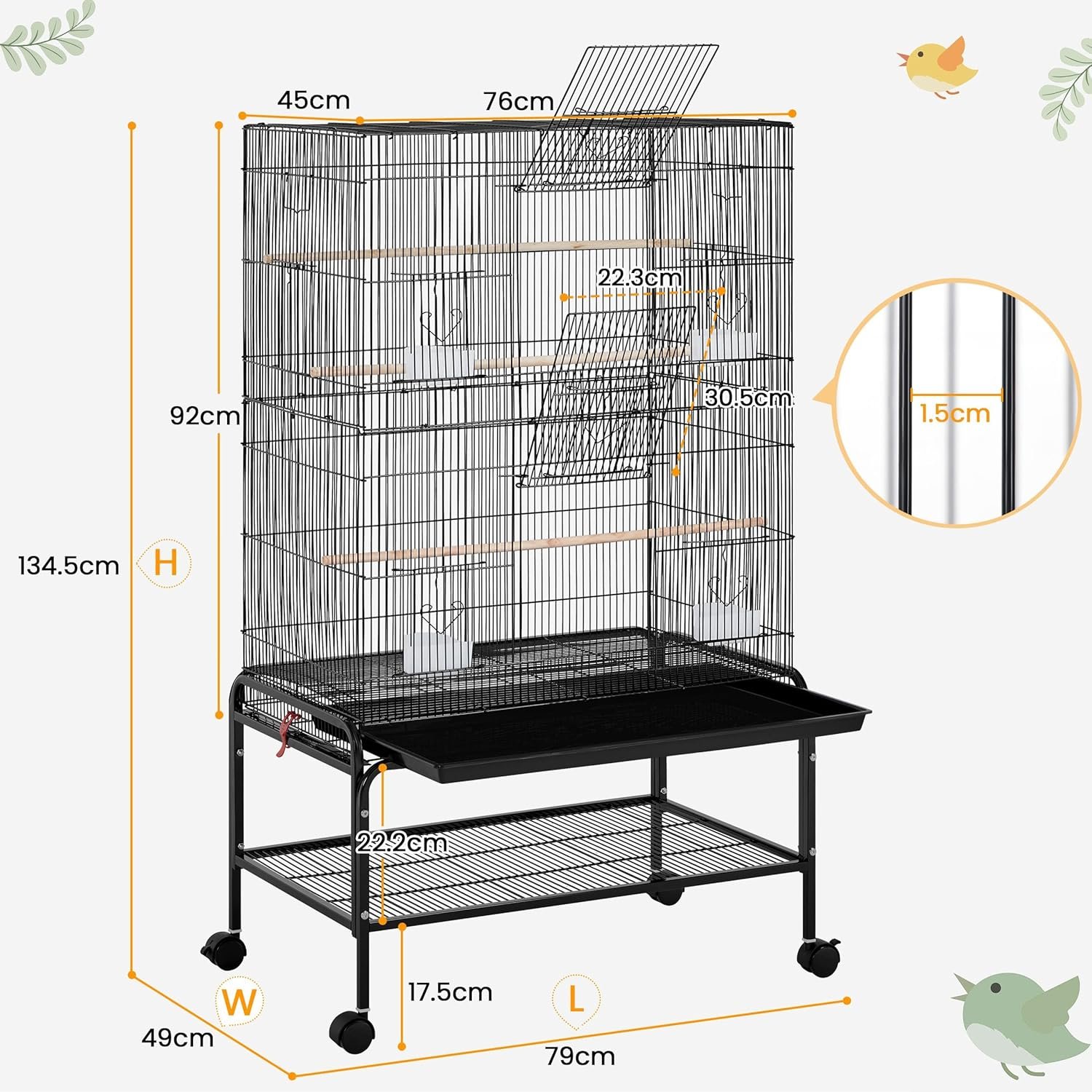 Dieser Vogelkäfig bietet einen gemütlichen und sicheren Lebensraum für Ihre gefiederten Freunde. Mit der Aufstellmaß von 79 cm L × 49 cm B × 134,5 cm H und dem Gitterabstand von 1,1 cm eignet er sich ideal für die kleinen und mittelgroßen Vögel wie Wellensittich, Nymphensittich und dergleichen.