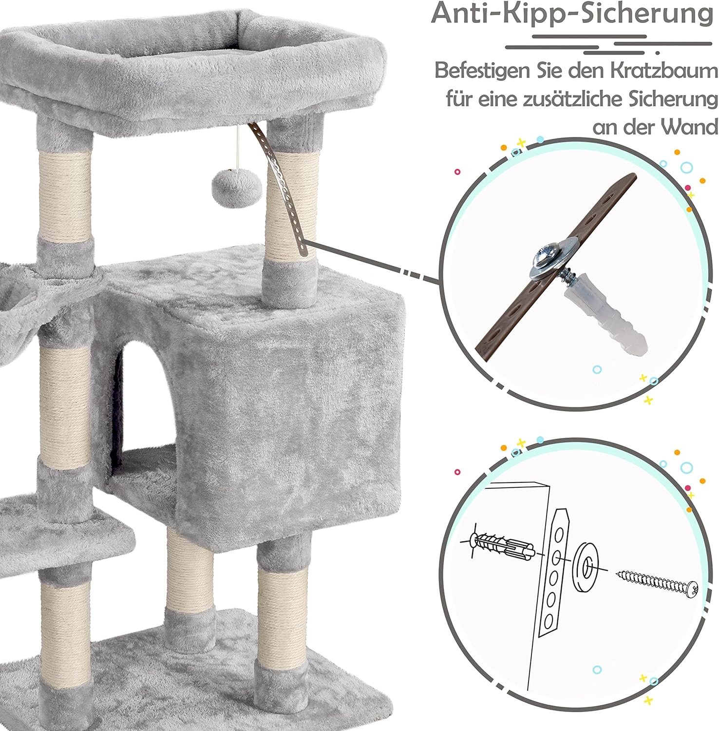 Spielplatz für Katzen: Mit einer Höhe von 96 cm besteht dieser 4-schichtige Kratzbaum aus einer Aussichtsplattform, einer Liege, einer Katzenhöhle, 6 Sisalstämmen und einem Plüschball
