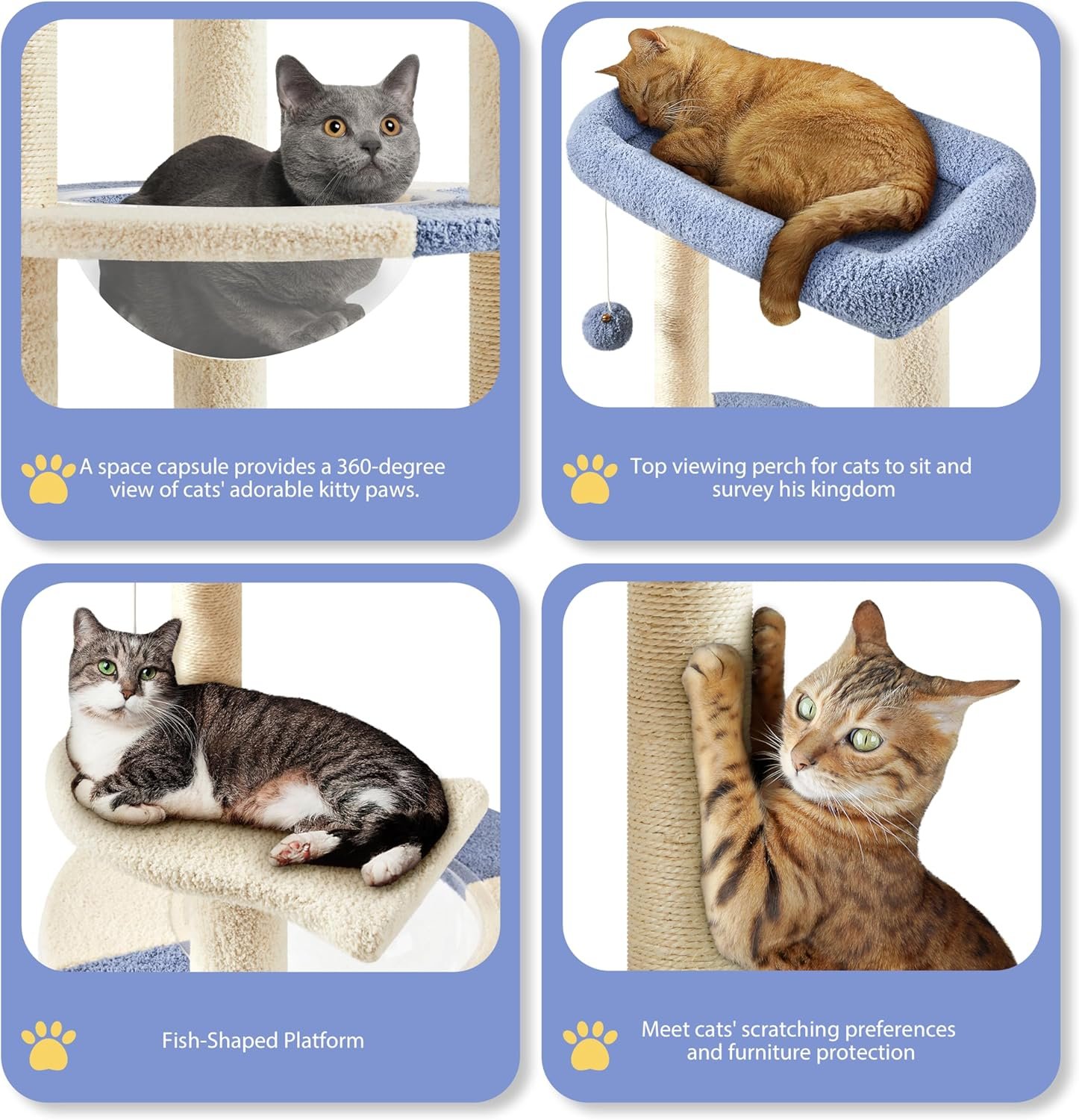 Das kreative Ozeandesign dieses stilvollen Kratzbaums kombiniert lustige Funktionen mit einer harmonischen Farbgebung. Das Raumkapsel-Spielhaus, die fischförmige Plattform und die kuschelige Plüsch-Schlafstange bilden zusammen einen wirklich luxuriösen, natürlich schönen Katzenturm für Ihre geliebten Kätzchen.