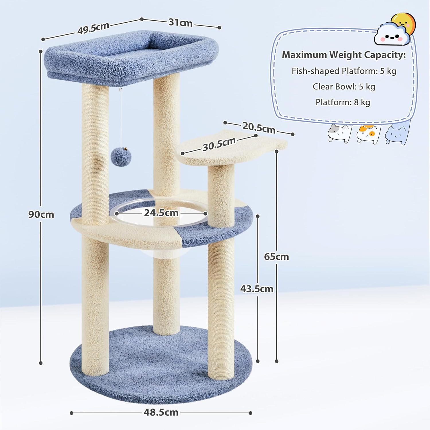 Dieser vom Meer inspirierte Kratzbaum im maritimen Stil besticht durch seine luftige und verspielte Farbkombination aus Pastellblau und Beige mit einem niedlichen Fisch-Design.