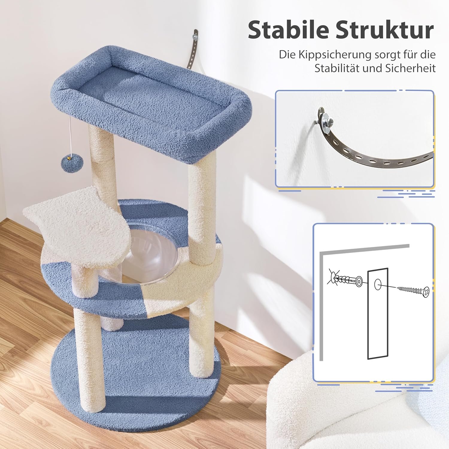 Abnehmbarer Plüschball. Mit diesem hängenden Plüschball können die Kätzchen die Jagd in vollen Zügen genießen. Sie können den abnehmbaren Ball durch ein anderes Spielzeug ersetzen